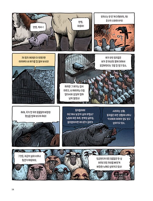 조지 오웰의 <<동물농장>> 을 그림책으로 만들 듯, 농장 동물을 주인공으로 내세워 인간 사회를 풍자한다.