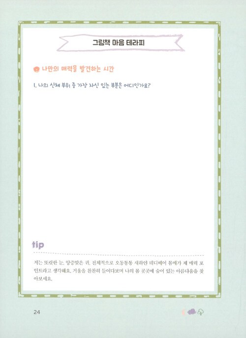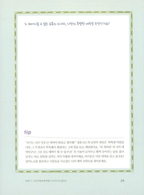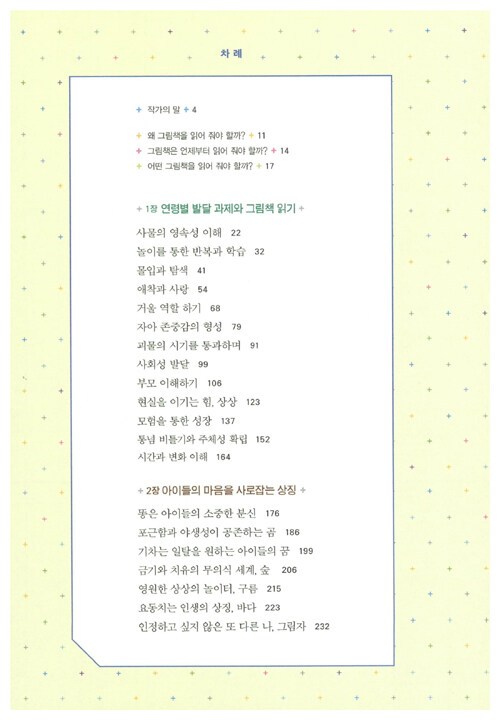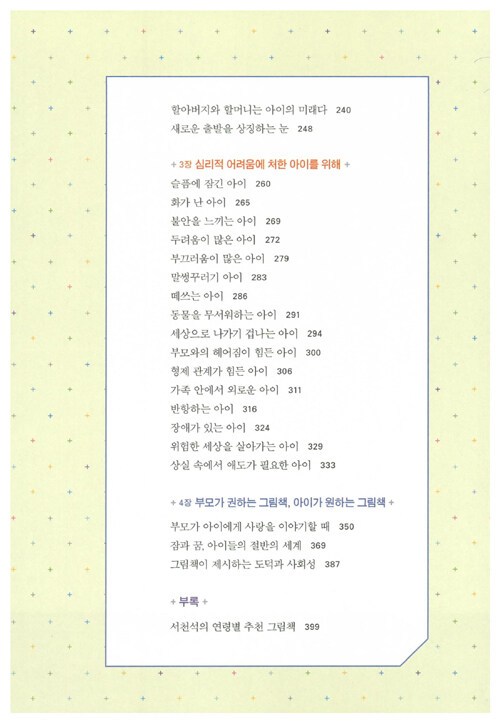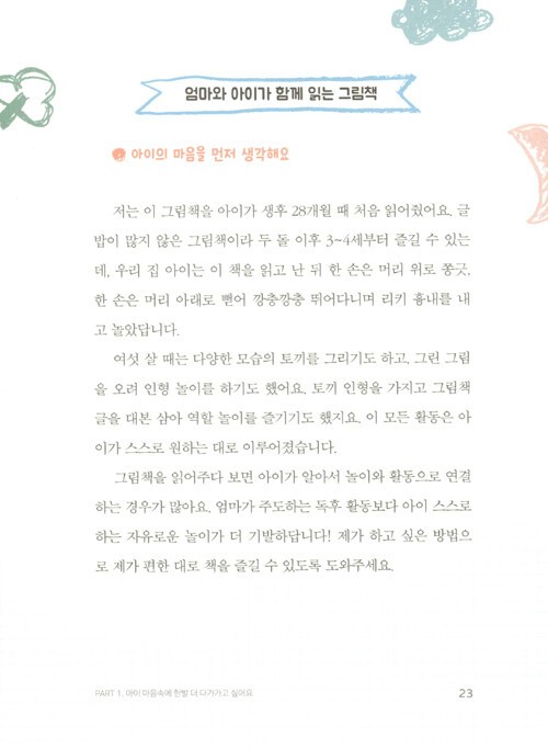 목차에 따라 섹션을 색깔별로 구별해 놓았기 때문에 꼭 순서대로 읽기 않아도 되는 장점이 있다. 원하는 부분부터 읽으면 되고 부록으로 저자가 추천하는 연령별 추천 그림책을 실었다. 책을 읽는 동안 아이 성장에 딸아이는 어떤 감정을 가지고 있는지 그림책을 통해 아이 마음과 소통할 수 있다.