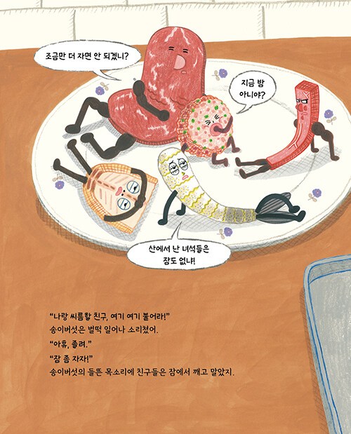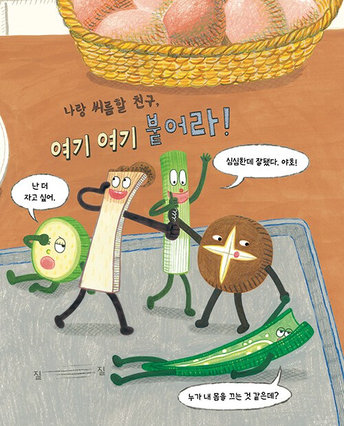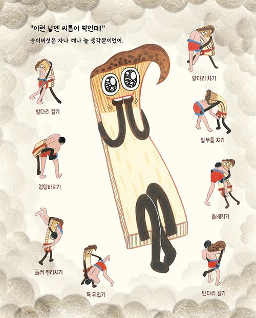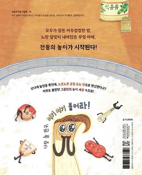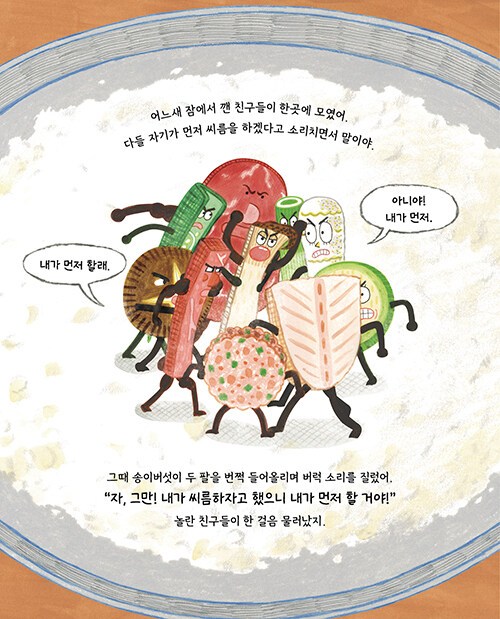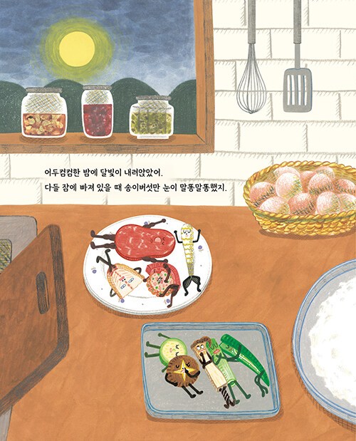 어두컴컴한 밤, 노랗고 둥근달이 뜬 날, 부엌에 있던 음식 친구들이 모두 잠에 빠져 있을 때 놀기 좋아하는 송이버섯만 눈이 말똥말똥했다. “나랑 씨름할 친구, 여기 여기 붙어라!” 송이버섯은 참지 못하고 친구들을 깨웠다. 잠을 자고 있던 친구들은 갑작스러운 송이버섯의 제안에 불평을 늘어놓았지만, 너 나 할 것 없이 놀이 장소로 모여 밤새 신나게 놀았다. 한참 뒤 정신을 차리고 보니 음식 친구들이 노릇노릇하고 맛깔스러운 전들로 변해 있었다. 음식 친구들이 신나게 노는 사이에 과연 무슨 일이 일어났던 걸까?