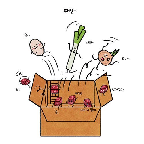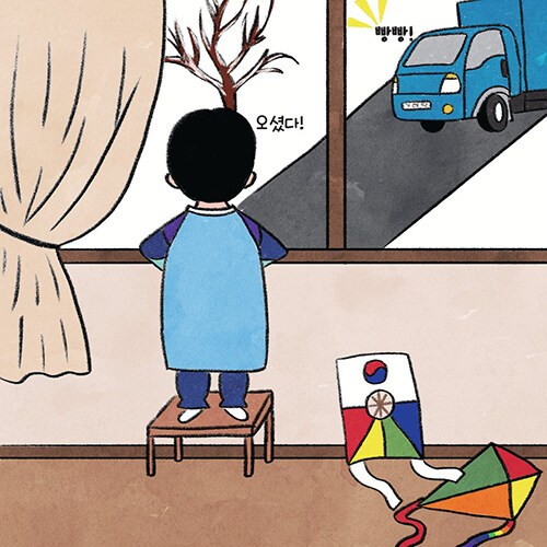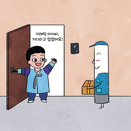 세상에서 제일 반가운 손님이 택배 아저씨라는데, 《새해 복 택배 왔습니다!》는 어른이나 아이 할 것 없이 기다리고 반기는 택배에 대한 이야기이다. 그냥 단순한 택배가 아닌, 새해를 맞이하여 도착한 아주 특별한 ‘선물’이다. 뭐니 해도 택배 상자를 열어보는 순간이 제일 두근거리듯 그림책 속 주인공 남자아이도 설렘으로 언박싱한다. 특별한 선물일 거라 기대했는데 상자 안에는 대파, 양파, 달걀, 소고기 등 '떡국'을 만들 때 사용하는 재료들이 들어있다. 실망한 아이를 뒤로한 채, 택배 상자에서 나온 채소들이 바쁘게 움직인다.