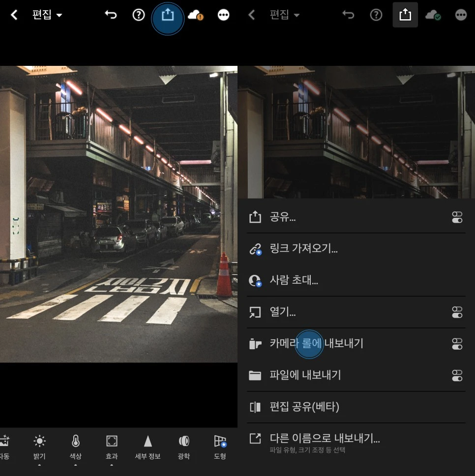 이렇게 완성된 사진은 사진 맨 위 상자 안에 위로 향한 화살표가 있는 버튼을 눌러줍니다. 이후 카메라 롤에 내보내기를 누르시면 핸드폰 안 갤러리에 저장이 됩니다.