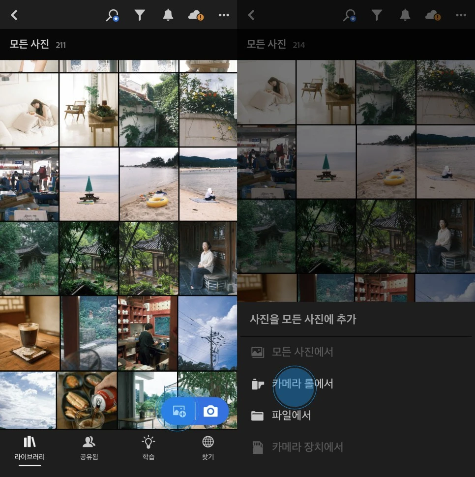 먼저 애플스토어나 구글플레이스토어를 통해 Lightroom 어플을 설치하시고 실행시키셔서 이전 사진을 불러오시거나 어플 내에서 사진 촬영을 하시면 됩니다.
