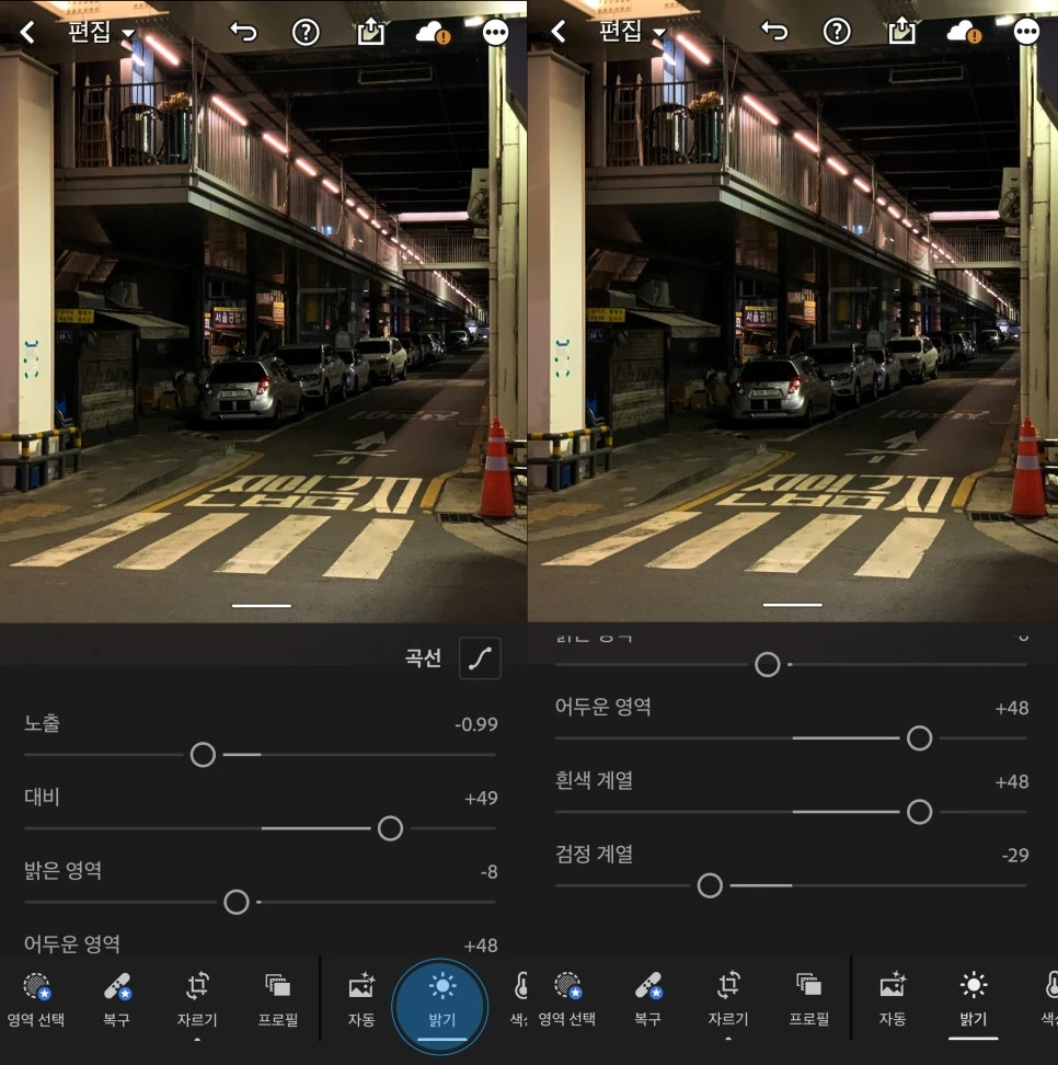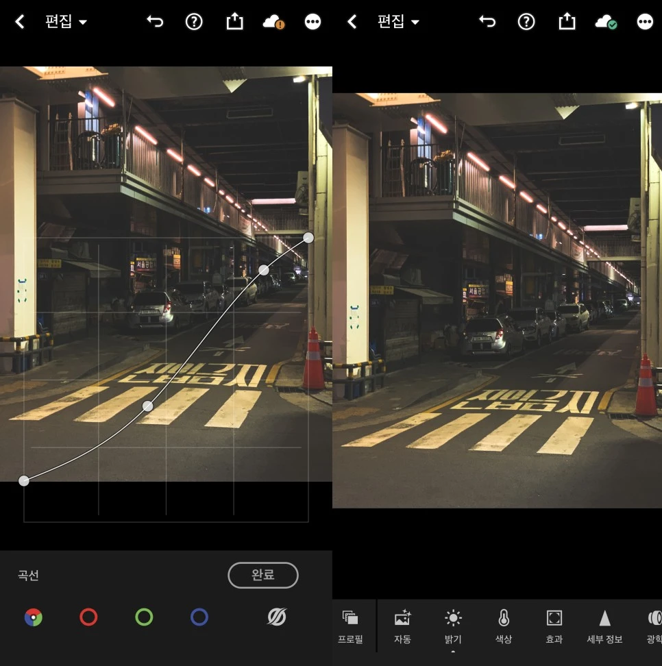 그리고, 저는 밝기에서 톤 곡선(커브)을 조절해서 살짝 톤을 빼주어서 을지로에 맞는 필름 느낌의 색감을 살렸습니다. 단, 온 곡선을 사용하시게 되면 이질적인 느낌이 강해질 수 있으니 조금씩 조절하시는 걸 말씀드리고 싶습니다. 하지만 조금씩 만져보시면서 이럴 땐 이렇게 저럴 땐 저렇게 등 자신만의 노하우가 잡힐 수 있는 큰 기능이 될 수 있습니다.