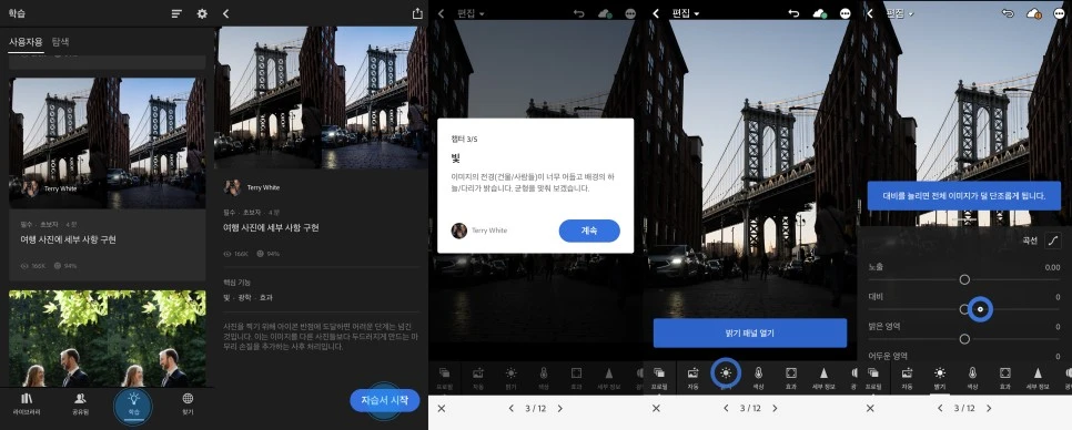 모바일 라이트룸에는 사용자를 위한 학습 기능이 있습니다. 이 기능은 라이르룸이라는 보정 어플을 처음 사용하는 사람 혹은 중급자까지도 많은 도움이 되는 기능이라고 생각됩니다. '역광이 자연스러운 인물사진', '빛과 색으로 음식 사진 돋보이게 하기', '일출에 생기를 불어넣기' 등 사진 찍을 때 다양한 환경을 고려한 학습이 제공되고 튜토리얼에서 설정 하나하나 자세한 설명을 해주며 진행이 됩니다.