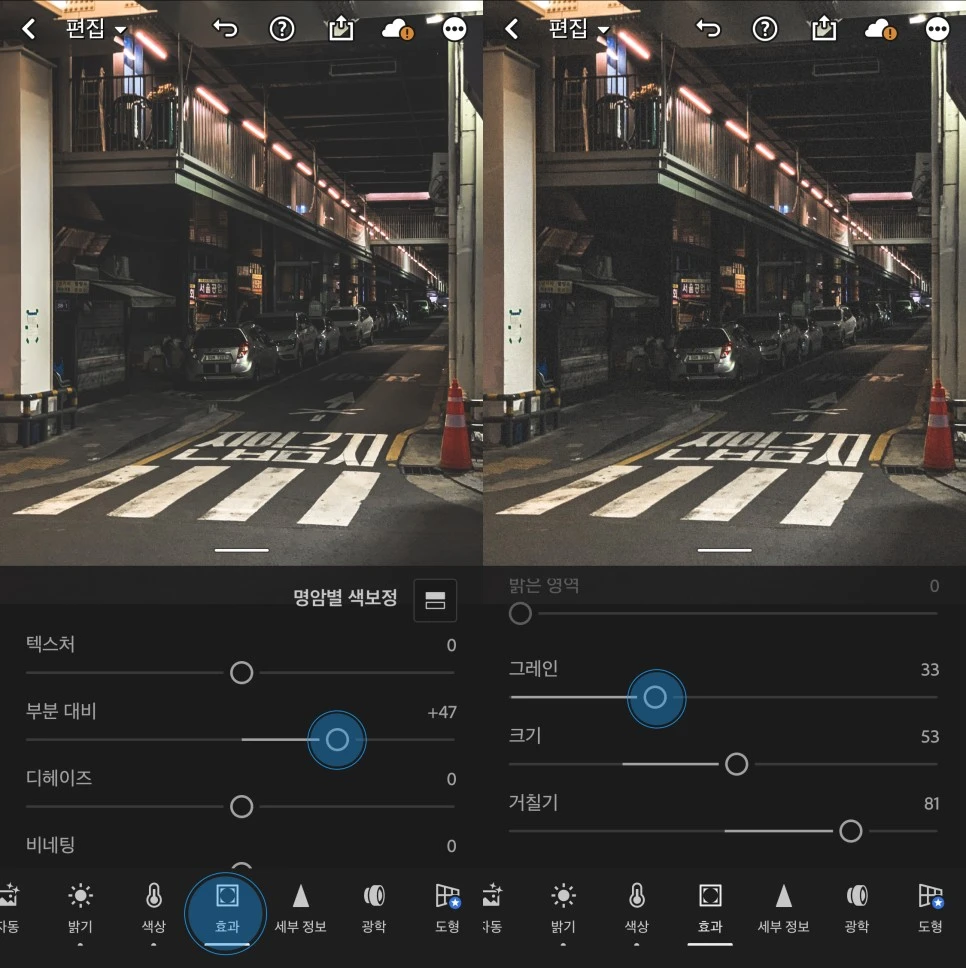 마지막으로 효과를 조절합니다. 이 기능 또한 직접 옮기면서 느낌을 파악해 보셔야 합니다. 저는 색상톤을 정리한 후 대비가 부족하다고 느껴져 부분 대비의 값을 올렸습니다. 또한 저는 필름 카메라의 느낌을 강하게 주고 싶어서 그레인을 많이 올렸습니다. 그레인을 옮기면 크기와 거칠기도 움직일 수 있는데 직접 욺직여 보면서 자신이 좋아하는 그레인 느낌을 찾으시면 됩니다. 저자는 그레인 효과를 매우 좋아합니다. 마지막에 뿌리는 마법가루 같다고 생각합니다.