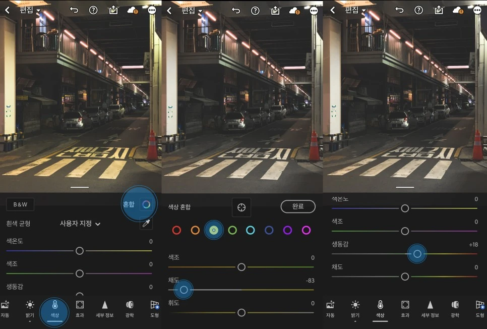 색상 또한 사진에 분위기에 맞게 직접 이리저리 옮겨보면서 사진에 맞는 색상을 조절하시면 됩니다. 저는 밝기를 조절한 후 노란색 색감이 진하다는 게 느껴져서 색상에서 혼합으로 들어가 노란색 계열의 채도를 많이 낮추었습니다. 그 이후 많이 물 빠진 느낌이 들어 생동감을 살짝 올려 주었습니다.