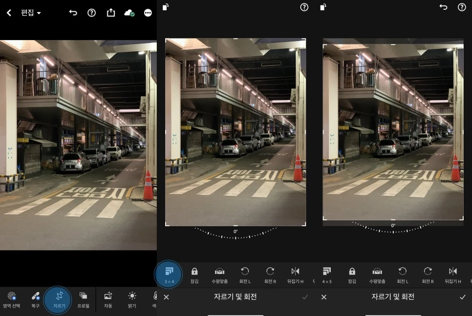 사진을 보정하기에 앞서 필요 없는 부분이나, 사진에 방해를 주는 요소를 자르고 시작합니다. 이때 사진의 수평이 맞지 않다면 수평을 조절해서 잘라 줍니다. 저는 주로 인스타그램에 사진을 게시하기 때문에 인스타그램에 가장 꽉 차게 들어가는 세로 사진 4:5비율로 많이 자릅니다.