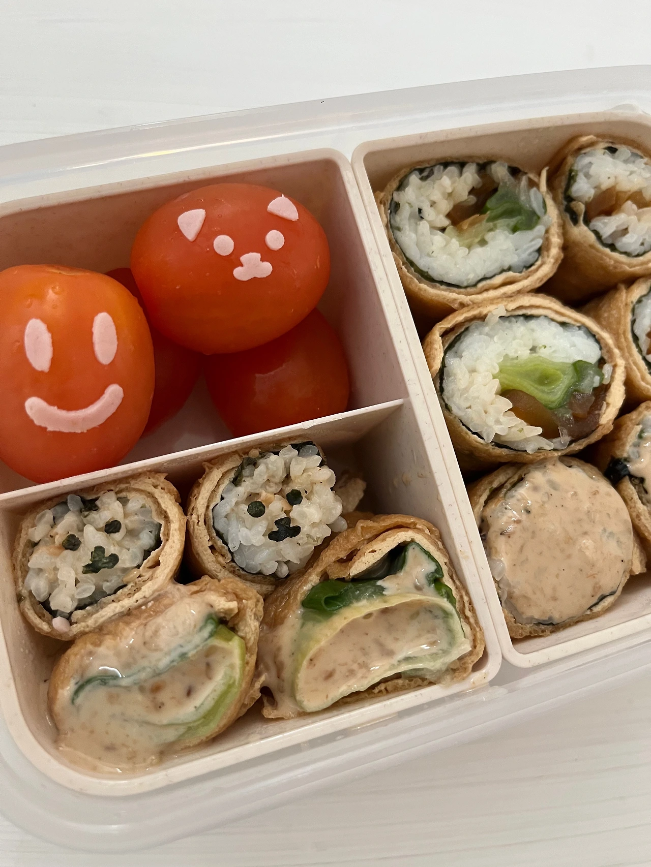 방울토마토, 샌드위치 햄, 펼친 유부, 쌀밥, 김, 무짠지, 대파
