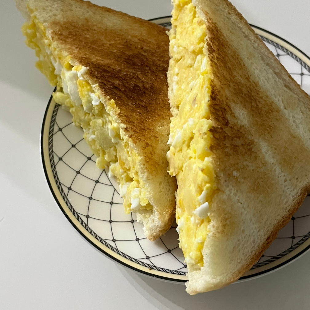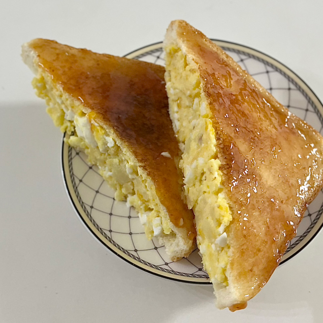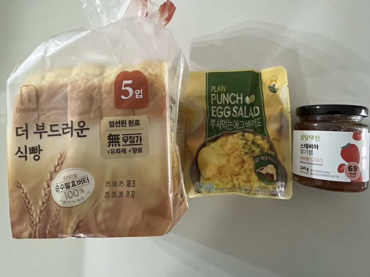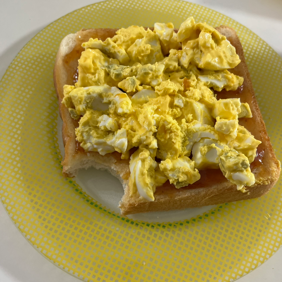 식빵 위에 잼을 바르고, 으깬 시판용 에그샐러드를 얹어 주면 완성이다. 간단하고 맛있다.