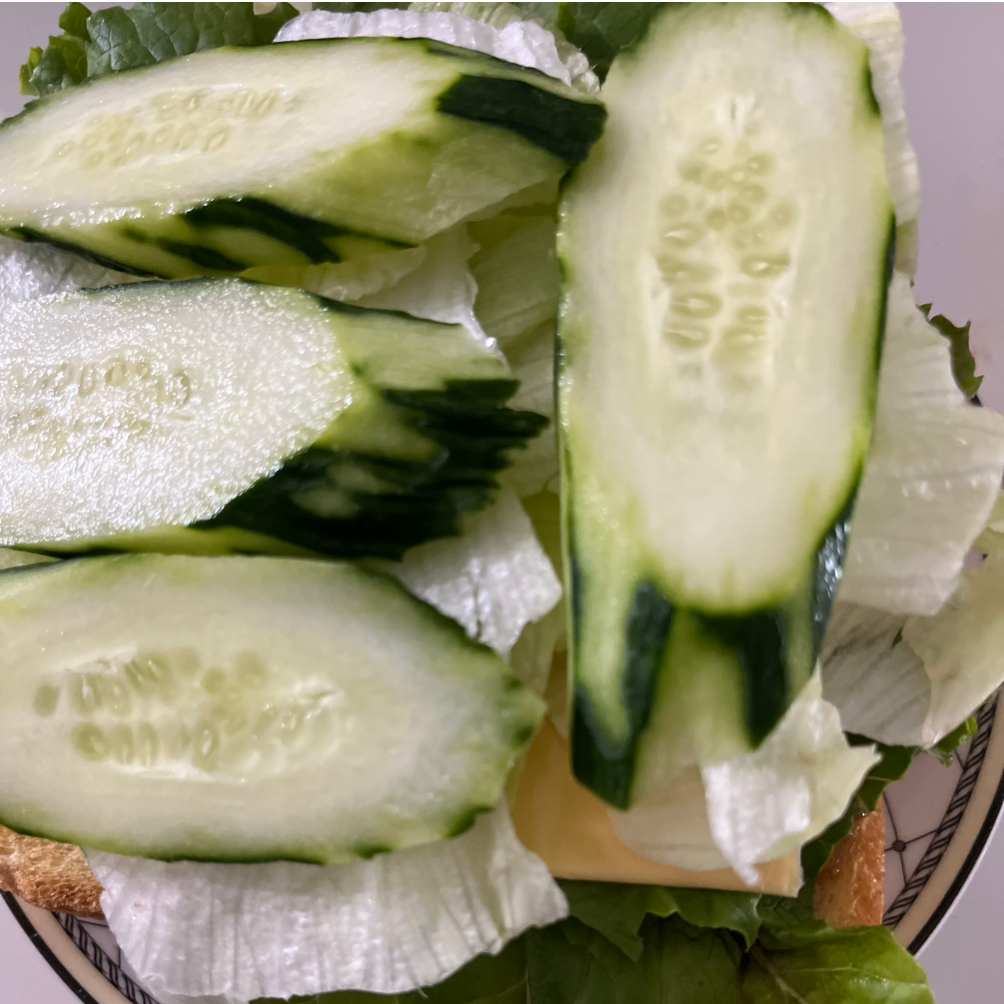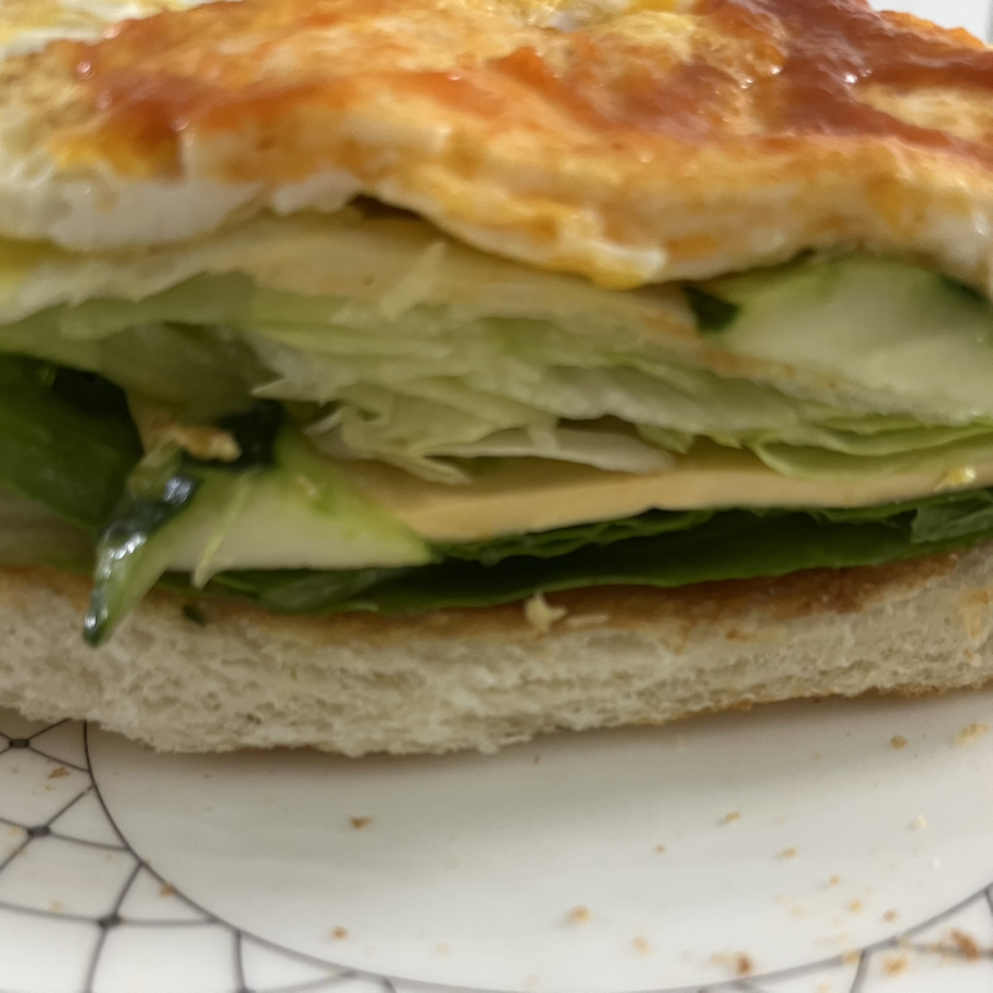 구운 식빵 위에 로메인, 양상추, 오이, 체다치즈, 계란프라이를 얹은 뒤, 머스터드와 스리라차를 뿌려주면 완성이다. 아삭한 식감이 매력적인 샌드위치다.