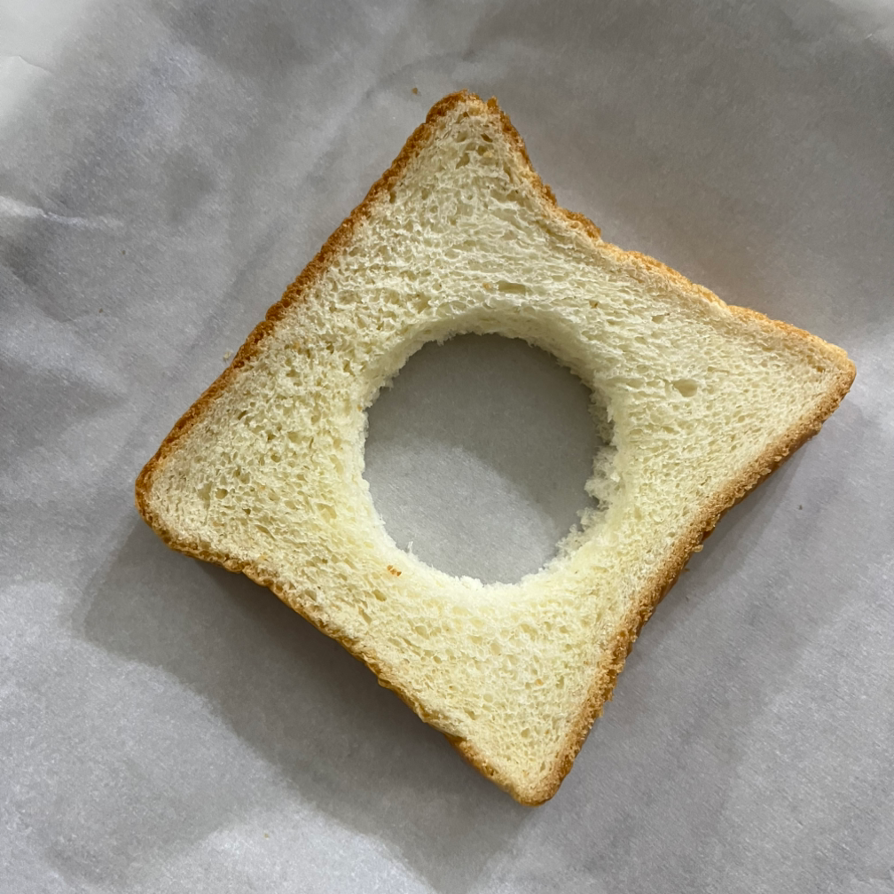 식빵에 동그랗게 구멍을 내 준 식빵을 얹고 구멍에 계란을 까 넣는다.