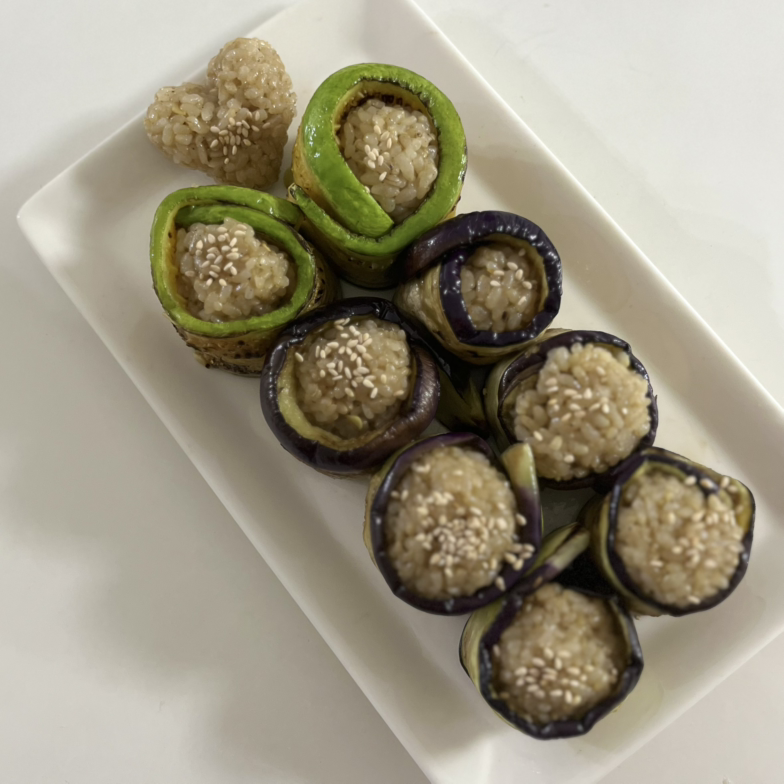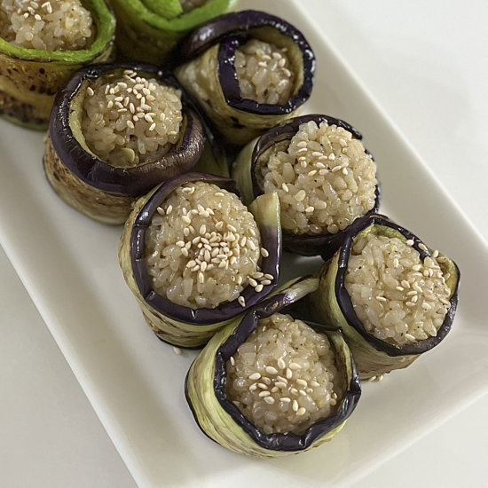 미니 주먹밥에 구운 가지와 애호박을 둘러준다.