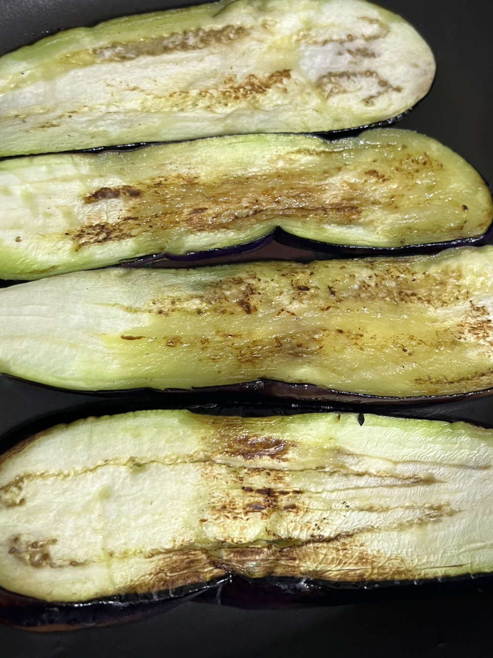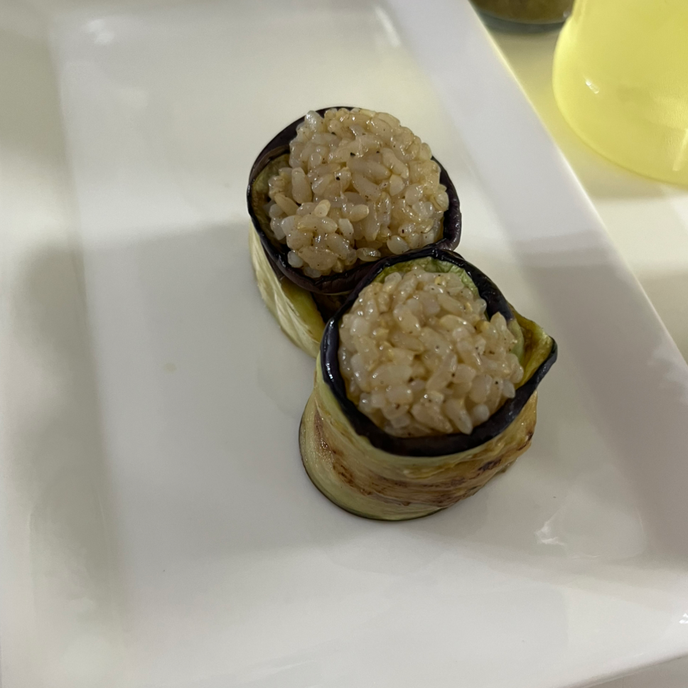 가지, 애호박, 올리브유, 현미밥, 소금, 설탕, 후추, 진간장, 볶은 참깨(선택)