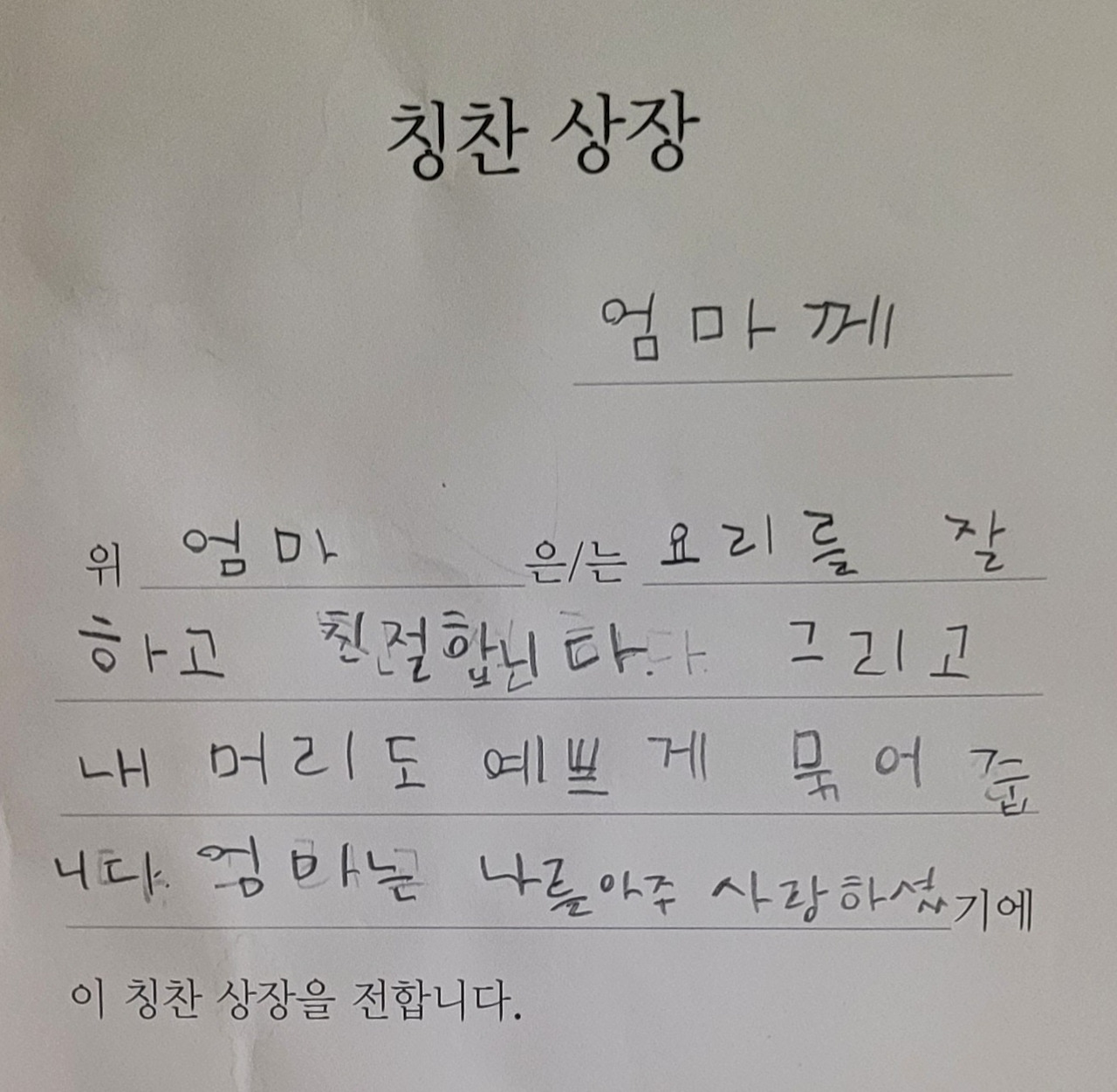 딸아이는 우리 가족 칭찬 상장에 당당히 "우리 엄마는 요리를 잘하신다"라고 써놨지 뭔가.