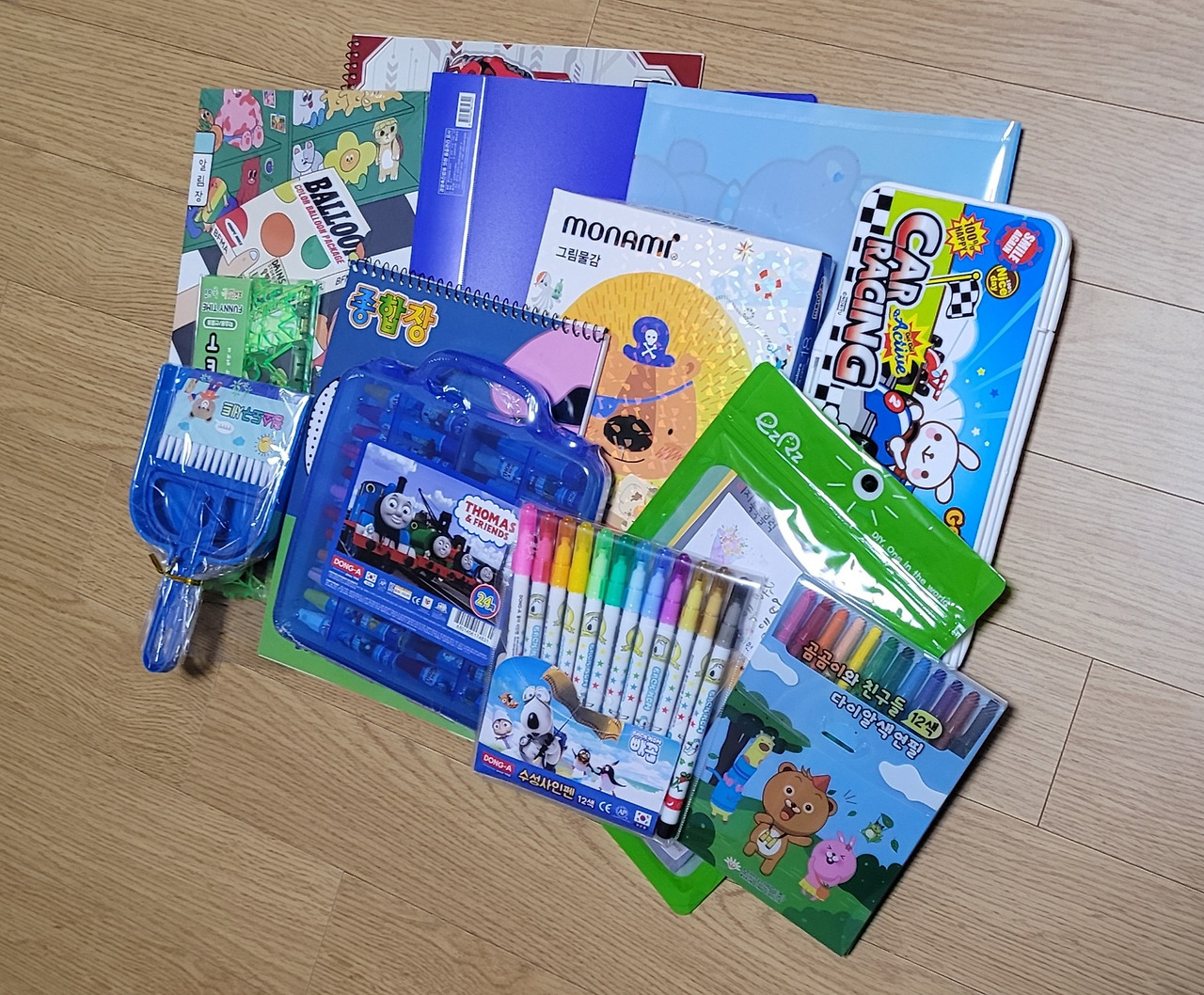 작년에 둘째 유치원에서 6살 마치는 선물로 크레파스랑 사인펜을 주신 게 있는데 그걸 몰래 숨겨두길 잘했다. 애들이 보면 벌써 찔끔 사용하고 어딘가로 제 짝 잃고 돌아다녔을 텐데 말이다. 그건 큰아이에게 선물인 듯 선심 쓰면 되니, 다 준비완료되었다.
