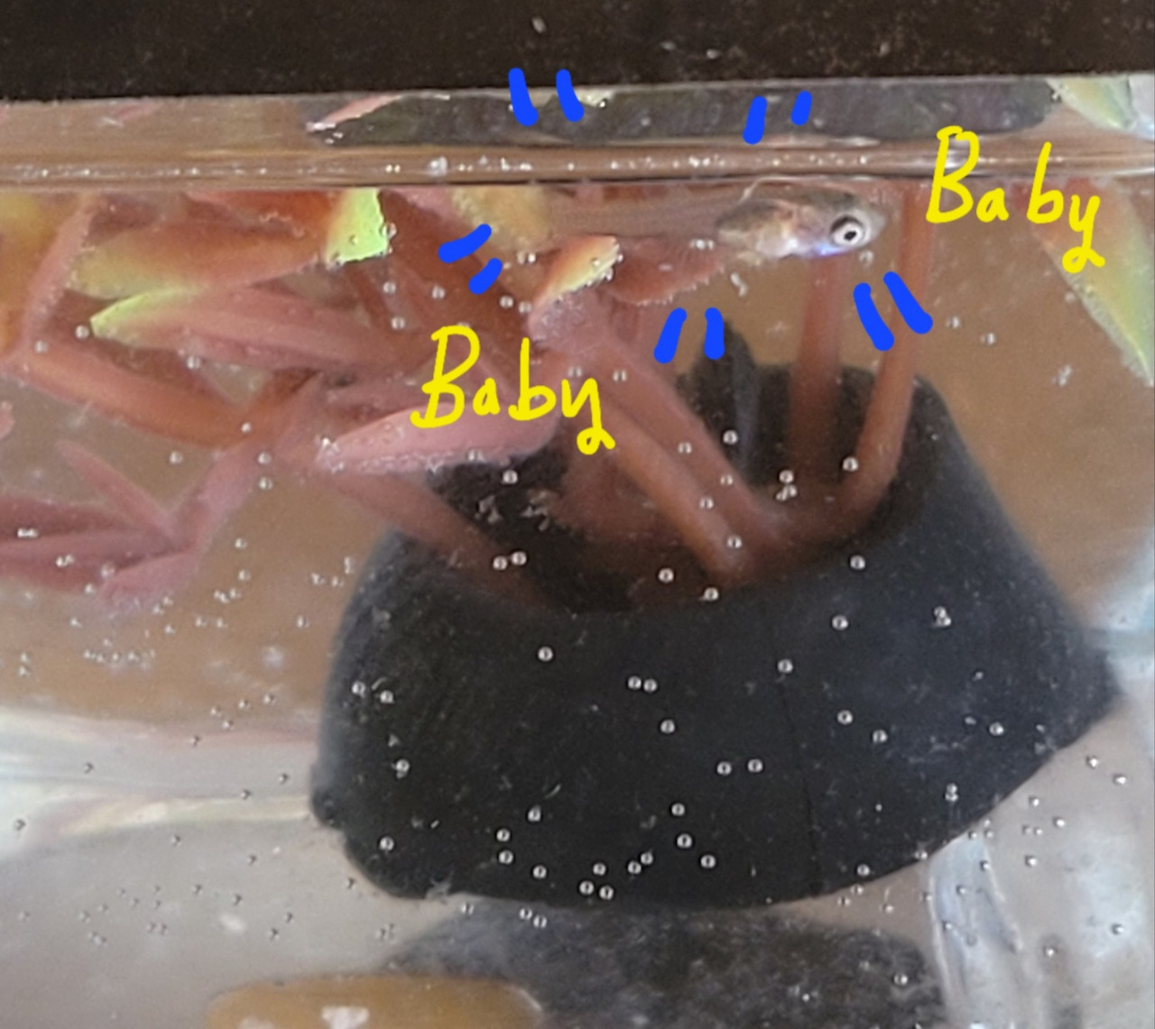작은 그릇으로 아기를 들어내보려 했으나 요리조리 잘도 피하는 것이 건강하기도 엄청 건강한가 보다. 아기를 분리하고 먹이를 준 후 작은 수초모형도 아기 어항에 넣어주었다.