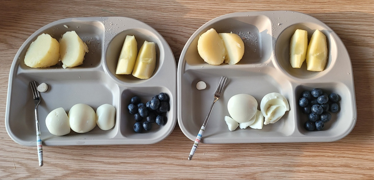 아이들은 역시나 삶은 감자를 잘 먹지 않았다. 그래도 노른자를 뺀 계란 흰자를 뚝딱, 블루베리를 후루룩 먹었다. 야심 차게 준비한 감자를 싫어하니 내일 아침은 또 무엇을 먹여야 할지 하루 만에 이번 메뉴도 실패다.