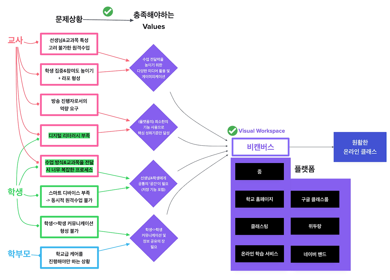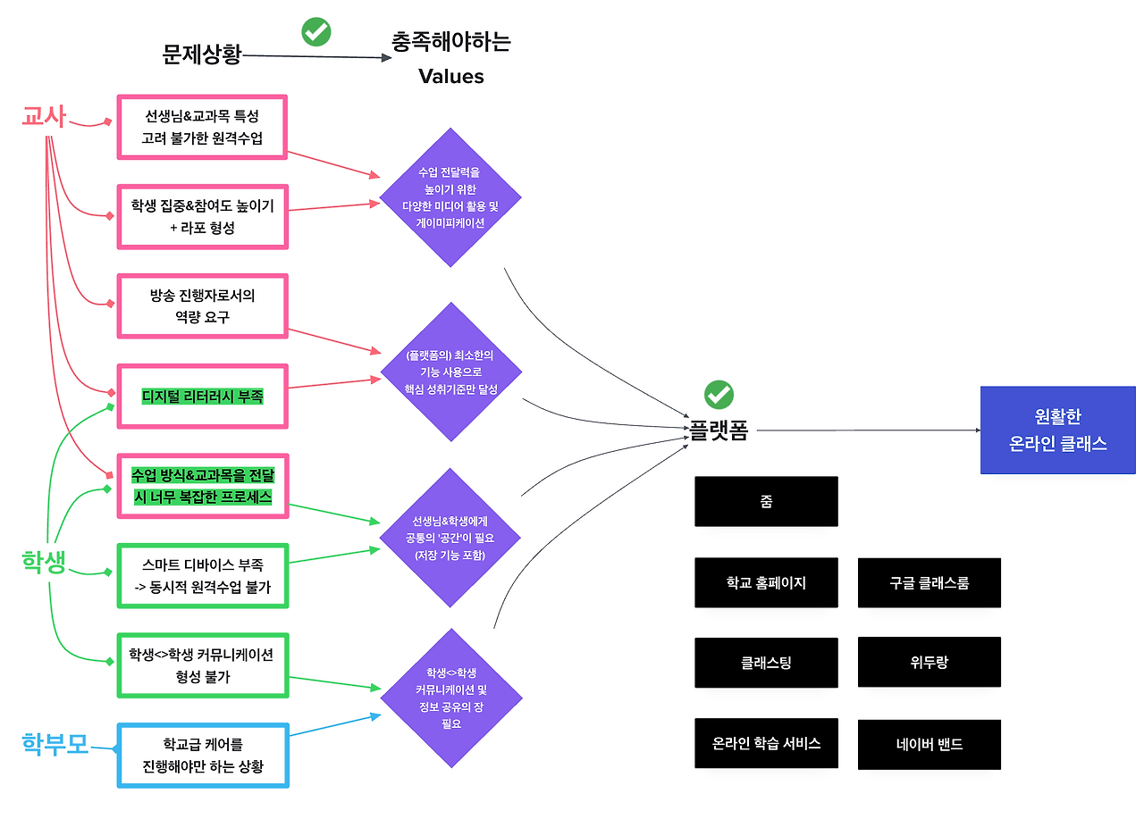 우선적으로 위에서 일어나는 각 문제상황을, 각 개별 플랫폼에 대입하면서 해결하려고하면 근본적인 문제 해결은 이루어지지 않는다. 위에서 일어난 각 문제상황들의 공통점을 찾고 여기에서 '결국 온라인 클래스를 진행하기 위해 충족해내야만 하는 최소한의 Values'를 찾는 관점에서 바라보도록 하자.