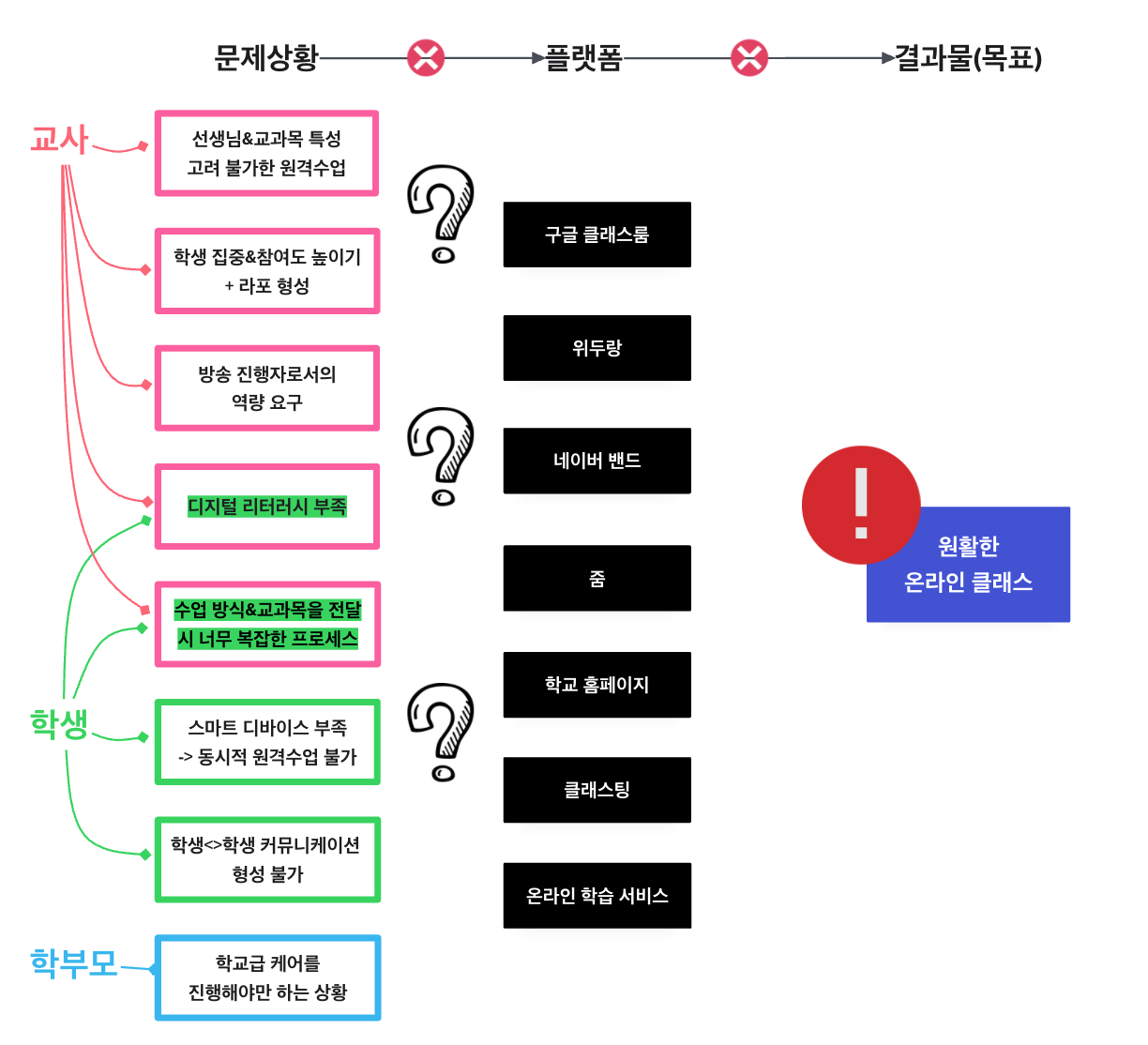 - 여기에 각자의 수업 방식과 교과목을 최대한 잘 전달하기 위해 사용하게 되는 플랫폼, 커뮤니케이션 방식, 파일 주고받고 피드백 주고받는 방식이 너무나도 복잡하다. 프로세스화 또한 불가능.