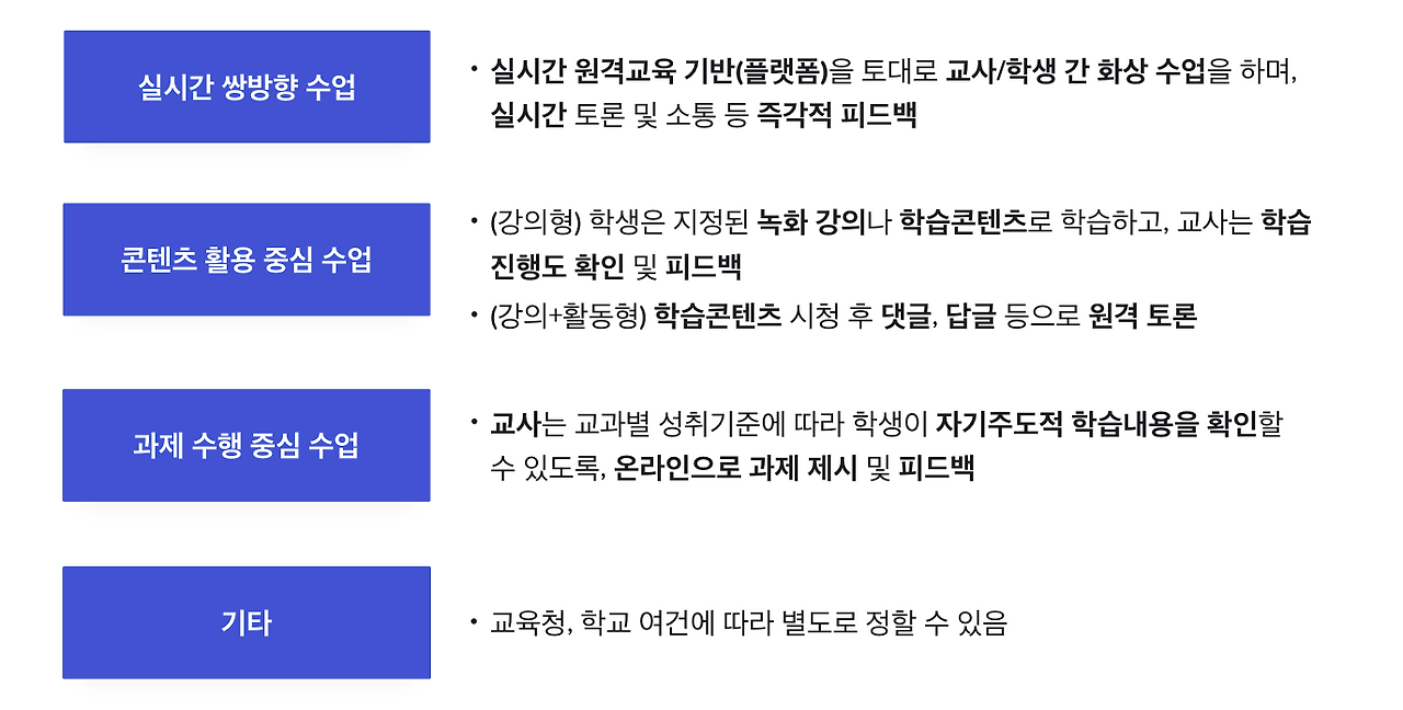 세부 내용은 다양하나, 우선 가장 중요한 '원격수업의 유형별 운영 형태'는 다음과 같이 규정하고 있다.