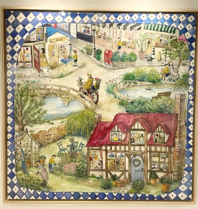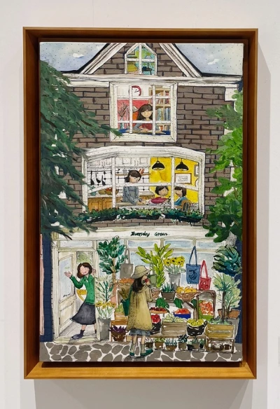 등장인물 중에 가장 크게 비중 있게 정중앙에 그려진 인물은 아이를 자전거 뒷좌석에 태우고 어딘가로 열심히 가는 엄마이다. 인물은 그림 속에서 아이와 쇼핑을 하고, 연못가에서 휴식을 취하기도 하고, 정원의 꽃을 가꾸기도 하며 일상에서 벌어지는 내러티브를 하나의 화면에서 보여준다. 자연과 조화를 이룬 그림 속의 거주지는 상상의 공간일 수도 있지만 무성한 나무가 빼곡히 자리를 잡고 있는 작가의 실제 거주지를 은유적으로 표현한 것이 아닐까 조심스럽게 추측해 본다. 자신의 집을 시선을 사로잡는 붉은색 지붕이 있고 외부를 향해 뚫려있는 큰 창이 있는 곳으로 표현한 작가는 거주 공간인 집에 대한 애정이 많고 외부와 적극적으로 소통하고자 하는 의지를 작품 속에 녹여낸 듯하다.