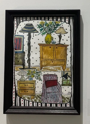 '나에게 행복을 주는 피사체들'에는 기하학적인 도트 패턴의 벽지를 바탕으로 선적으로 배치된 가구들이 등장한다. 작가는 매일매일 변화하는 감정과 달리 가구들은 늘 그 자리에 같은 모습을 보여준다며 위의 작품을 제작했다. 평면적인 특성으로 19세기 말 인상주의 화가들에게 큰 영향을 미친 일본의 목판화 우키요에를 연상시키는 이 작품에는 빈티지한 디자인의 가구들과 패턴을 가진 소품과 화병에 꽂힌 꽃들이 등장한다. 액자 프레임 속에 스트라이프 패턴이 프레임처럼 재등장하고 그 안에 가구들이 배치된 실내공간은 이중으로 형성된 프레임 속에 그려졌지만 답답함이 느껴지기보다는 원근법이 사라져 무한으로 확장해나가는 느낌을 준다.'나에게 행복감을 주는 피사체들' 속에 등장하는 사물들이 제공하는 일상의 평온한 감정들은 연속적인 시간의 개념 속에 지속적으로 존재하면서 확장되어 간다.