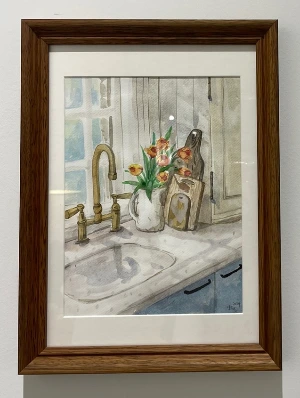 '행복한 내 공간'에서 보이는 주방은 엄마들이 가장 많은 시간을 보내는 공간이며 도마는 이 공간에서 자주 사용되는 사물이다. 착착착 울리는 소리와 함께 칼질된 재료로 아이의 이유식부터 일반식이 완성되는 주방은 행복이라는 감정보다는 노동이라는 키워드로 점철되기 쉽다. 그 노동의 순간에도 나름의 행복들이 배 사장의 모래처럼 잔잔히 존재하기도 한다. 재료를 다듬을 때 주방에서 느끼는 나와 자연의 교감, 설거지를 할 때 모든 것이 원점으로 돌아가 깨끗해지는 경험, 수많은 시행착오 끝에 드디어 딱 맞는 그 맛에 도달했을 때의 성취감. 인류의 역사와 수많은 매체에서 주방은 여성노동의 공간이고 이 노동을 해방하기 위해 끊임없이 주방가전이 발명되었지만 그럼에도 불구하고 주방에서는 디지털이 완전히 대체하지 못한 아날로그적인 과정들은 아직도 존재한다. 작가는 행복이라는 감정을 담아 자연광이 살포시 들어오는 창가의 반짝이는 싱크대와 튤립을 연상시키는 꽃들이 담긴 화병 그리고 햇살에 일광욕을 하고 있는 도마를 그려냈다. 이 장면에서는 고된 가사노동은 느껴지지 않는다. 그 가사노동이 끝난 이후의 평온함과 개운함이 느껴진다. 엄마들의 일상이 가장 많이 머무는 공간, 주방에 작가는 행복의 감정을 담고 싶었는지도 모른다.