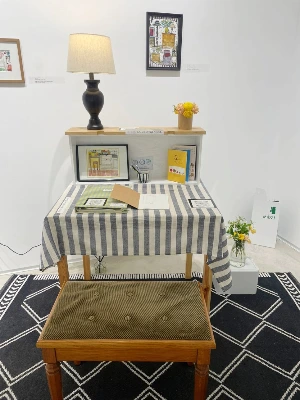 전시의 말미에 있는 방명록을 쓰는 코너는 아티스트의 책상처럼 재현되어 관람객들에게 전시를 보고 느낌 감상을 적도록 유도하고 있다. '방명록을 써주세요'라고 직접적으로 말하고 있진 않지만 기하학적인 문양 위에 올려진 클래식한 카키색의 콘솔에 담긴 농축된 시간들은 관람객이 이곳에 앉아보도록 인사를 건넨다.
