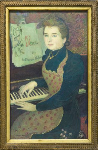 “응, 당시에도 애처가로 유명했나 봐. 프랑수아도 이미 알겠지만, 모리스는 인상주의를 벗어나 상징주의를 시작하는 작가잖아. 그래서 작품 배경에 그려진 수많은 점들은 폴 시냐크의 점묘화의 점과는 전혀 다른 기능을 하고 있어. 폴 시냐크는 요즘 컴퓨터의 픽셀처럼 색의 단위로 반영하여 질서 정연하게 색을 정렬해서 아름다운 장면을 연출했다면 모리스의 경우에는 리듬감을 표현하기 위해 점을 사용했지. 실제로 모리스는 폴 시냐크의 점묘화 작품은 너무 과학적이라면서 자기와 비교하는 것을 반대했었다고 해. 인상주의 화가들처럼 모리스도 자포니즘에 영향을 받아서 그림을 평면적으로 그리기도 했고. 모리스의 초상화는 실제의 모델과는 좀 다른 이미지로 그가 느끼는 바를 표현했어. 상징주의가 생각, 내적 환영, 꿈을 표현한 미술사조잖아. 모리스도 작품을 통해 자신이 보고 느끼는 마르트를 표현한 거지. 물론 실제의 마르트의 모습도 어느 정도 반영되었겠지.”