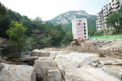 겸재 정선이 그린 인왕산의 모습 중 하나인 <수성동 계곡>은 서울특별시 도시 개발의 한 축을 그은 작품이기도 합니다. 그림 속의 수성동 계곡에는 1971년에 건립된 옥인동 시범아파트 단지가 2009년까지 존재했습니다. 9개 동 265세대가 그 자리에 살고 있었습니다. 시간이 흐르면서 아파트는 노후화가 진행되었고 2007년 대통령 경호실에서 청와대 주변의 유적지를 조사하는 과정에 기린교의 일부가 옥인동 시범 아파트 옆 암벽 옆에 존재하는 것을 발견했습니다. 아파트 단지를 철거하는 과정에 주민들의 시위가 있었지만 서울시는 이 자리를 겸재 정선의 <수성동>의 모습으로 복원하는 것으로 도시 개발 방향을 확정 지었습니다.