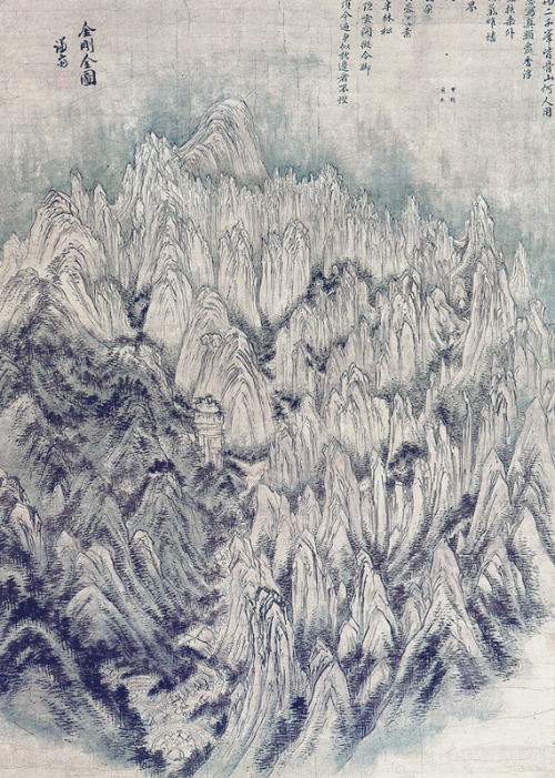 겸재 정선은 어떻게 36세, 37세에 다녀온 금강산 그림을 59세에 그린 것일까요? 당시 헬기, 드론, 사진이 없었던 시대였기에 겸재 정선은 자신이 다녀온 금강산의 면면을 한 군데 합쳐 극적인 그림을 완성했습니다. 실제로 금강산이 <금강전도>처럼 드라마틱하게 뾰족한 봉우리들이 한데 뭉쳐진 모습은 아닙니다. 겸재 정선이 기억하는 금강산이 나무숲과 바위숲이 빼곡히 모인 풍광이었던 것입니다. 그는 금강산에 올라 위에서 내려다본 하늘을 찌를 듯이 솟아오른 봉우리들을 원형 구도로 한데 모아 위에서 아래를 내려다본 부감법으로 금강산을 드라마틱하게 묘사했습니다. 작품을 들여다보면 원형으로 조밀하게 모여진 금강산은 가운데 흐르는 듯한 곡선으로 바위산과 나무산이 나눠져 있습니다. 이에 대해 주역에 능한 겸재 정선이 무질서와 혼돈의 상태를 창조와 질서의 의미를 담은 태극의 의미를 담아 작품을 제작했다고 해석하는 학자들도 있습니다. 겸재 정선의 자신만의 시각으로 독창적으로 표현한 금강전도와 그의 진경산수화에 대해 실학자로 잘 알려진 연암 박지원은 『열하일기』에서 '겸재 정선은 팔십이 넘은 나이에 촛불 아래에서 그림을 그려도 털끝 하나 틀림이 없다'라고 기록에 남기기도 했습니다. 그만큼 당대 사람들이 조선의 풍경에 대해 느꼈던 감정을 겸재 정선이 세밀하게 화폭에 담아냈던 것입니다.