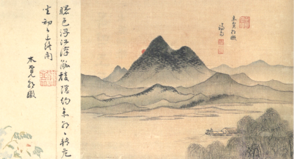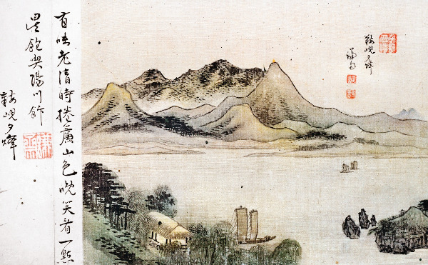 『경교명습첩』 상권에 수록된 작품 <목멱조돈도>와 <안현석봉도>는 양천현령 겸재 정선의 하루의 시작과 끝을 보여주는 작품입니다. <목멱조돈도>는 양천항교 근방에서 바라본 서울 남산의 모습입니다. 한강 너머 남산에 해가 걸쳐지기 시작하는 이른 아침의 풍경으로 서울 중심에 우뚝 서 있는 남산의 모습이 강한 붓터치로 먹의 농담을 살려 잘 표현되어 있습니다. 남산 앞에 그려진 한강도 유유자적하게 고요히 흐르고 있습니다. 지금의 남산과는 너무 다른 모습이지요?
