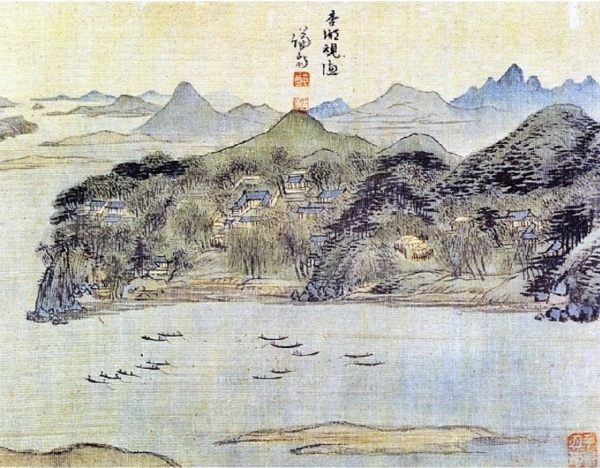 하단의 작품은 압구정에서 조금 더 내려가면 보이는 송파진과 광진의 과거 모습입니다. 겸재 정선이 작품으로 남긴 송파진, 광진, 동작진, 양화환도 등의 포구는 당시 조세와 물산을 실어 나르는 주요 교통로로 사회, 경제적 중요성이 큰 장소였습니다. 흥미로운 점은 겸재 정선이 묘사한 포구들의 위치에 현재 광진교, 동작대교, 양화대교 등의 서울시내 주요 다리들이 위치하여 여전히 서울의 교통과 물류의 통로로 활용되고 있다는 것입니다. 송파진의 모습 역시 압구정처럼 전반적으로 한적하고 한강 위에 나룻배가 떠 다니는 모습입니다. 행호관어도는 행주산성 아래편의 한강에서 고깃배들이 고기를 잡는 모습입니다. 지금도 한강에서 취미로 낚시를 하시는 분들을 종종 보지만, 한강에서 잡은 고기를 먹는 사람은 보지도 듣지도 못했습니다. 예전 한강물이 맑고 자연의 상태였을 때는 어부들이 생계를 위해 고기를 잡았다고 합니다. 정말 엄청난 변화를 거친 한강의 모습이지요?