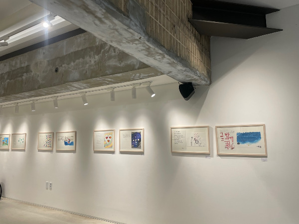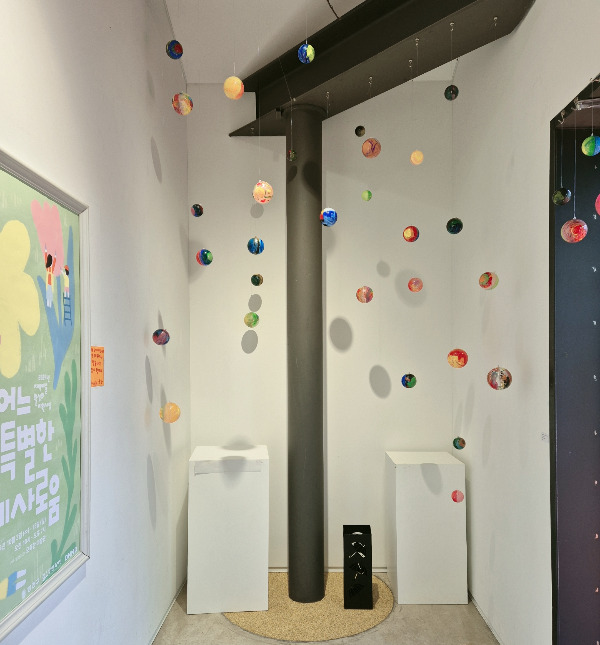 2024년 10월 1일 가을비가 살포시 내리던 화요일, <어느 특별한 예사로움> 전시의 디스플레이를 했습니다. 지난 한 달간 22명의 부모와 아이가 한 팀이 되어 제작한 드로잉, 에세이, 공동회화와 국공립해누리어린이집 5-7세 30명의 영유아들이 만든 <가족은 나의 우주>라는 제목의 행잉 모빌을 전시장 공간에 잘 어우러지게 설치했습니다. 국공립해누리어린이집 영유아들이 만든 행잉 모빌은 전시장에 행잉해 놓으니 귀한 존재감이 더 드러났습니다. "아이들이 만들었어요!"라고 설명하면 다들 눈이 휘둥그레지는 귀엽고 작지만 반짝이는 예쁜 모빌입니다.
