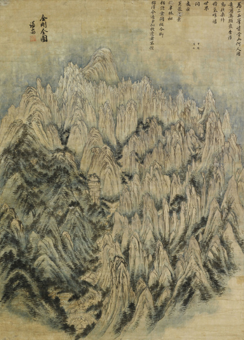 한 예로 겸재 정선의 금강전도를 살펴보겠습니다. 제가 <Weekly 겸재 정선>이라는 브런치북에서 소개한 작품 중 하나인 금강전도는 겸재 정선의 대표작입니다. 금강산의 봉우리를 하늘에서 마치 새가 내려다본 것처럼 하나의 시각으로 표현한 이 그림의 좌측 상단에는 '금강전도'라는 제목이 적혀있고 우측상단에는 60글자의 비문이 적혀있습니다. 이 기문에 대해 겸재 정선이 직접 작성했다고 오래 기간 동안 당연하게 받아들여왔지만 강관식 교수님(한성대학교 회화교 교수, 간송미술관 연구위원 및 문화재청 문화재위원으로 활동)은 겸재 정선의 본인이 아닌 후대의 소장가들이 작품에 대한 경의를 표하기 위해 훗날 더했다는 분석을 제시하셨습니다. 실제로 한국화의 경우 작가가 작품의 일부에 자신의 글을 남기기도 하지만 소장가들이 작품에 대한 감상을 남기는 경우도 종종 있습니다. 이런 경우 작품의 해석이 고정되는 것이 아니라 시대와 소장가에 따라 해석이 변화하는 역동성을 가지기도 합니다.