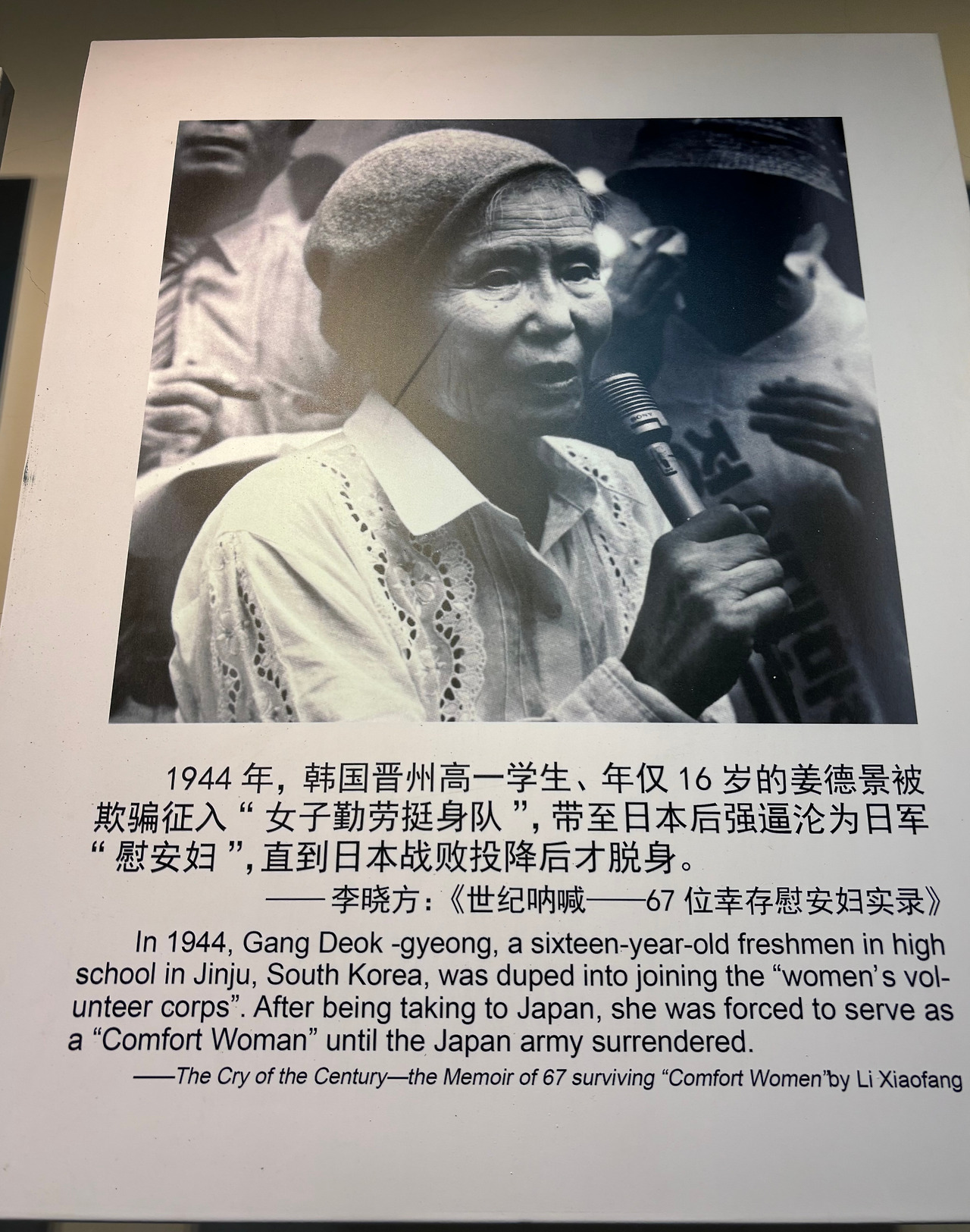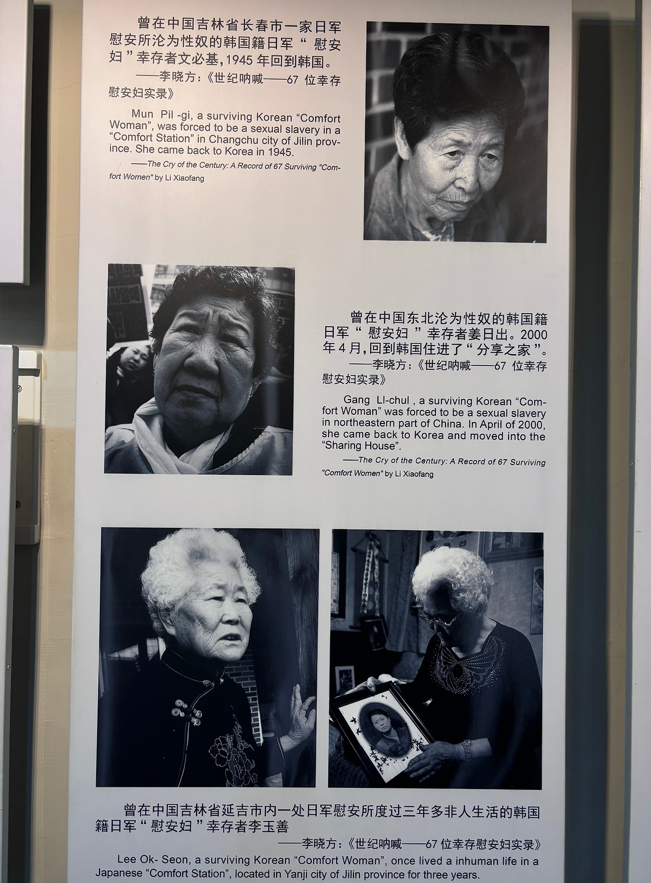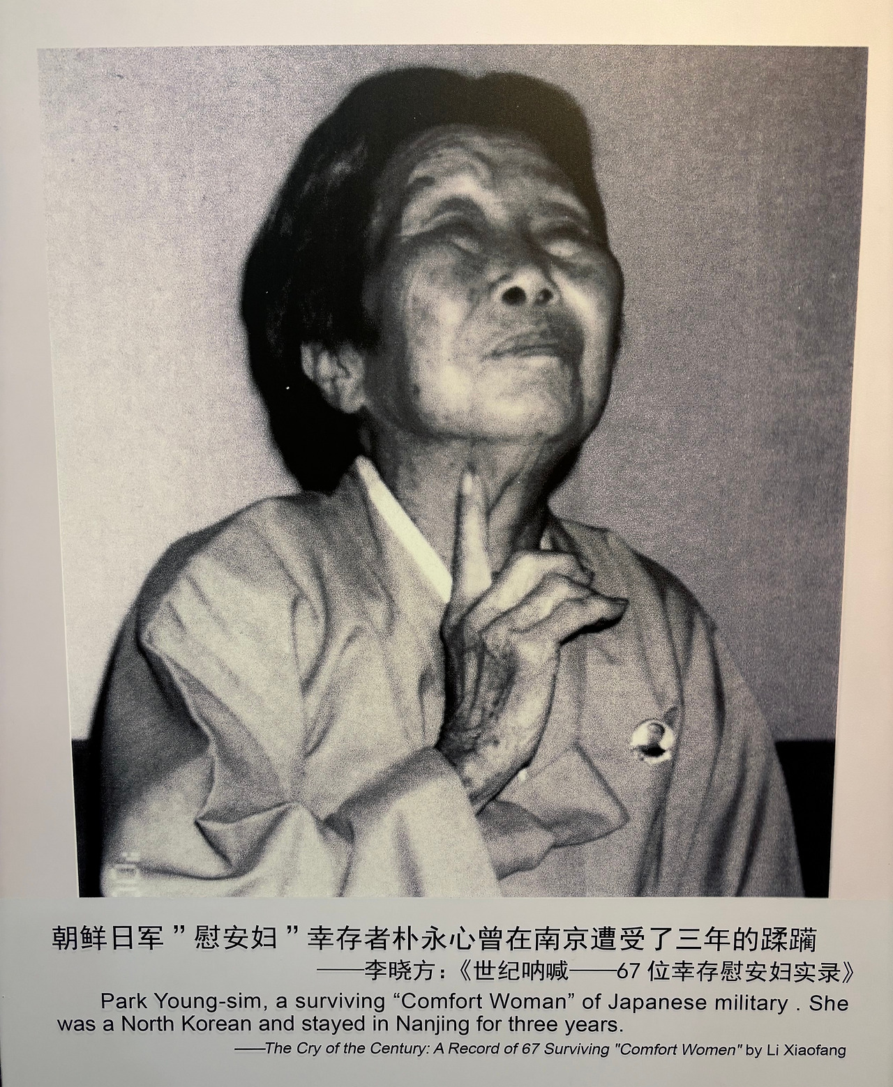 진열관 곳곳에는 모든 위안부 개개인의 사진이 걸려있고, 이름과 출신·국적 같은 간단한 소개가 적혀 있다. 많은 이들이 중국인이었지만, 박영심 할머니를 비롯해 한반도 전역에서 그리고 다른 아시아 국가에서 끌려온 여성들의 얼굴도 보였다. 전시물의 설명글은 중국어·영어는 물론이고 한국어·일본어로도 쓰여 있다. 그 어떤 언어로도 이 야만의 역사를 외면하기란 불가능했다.