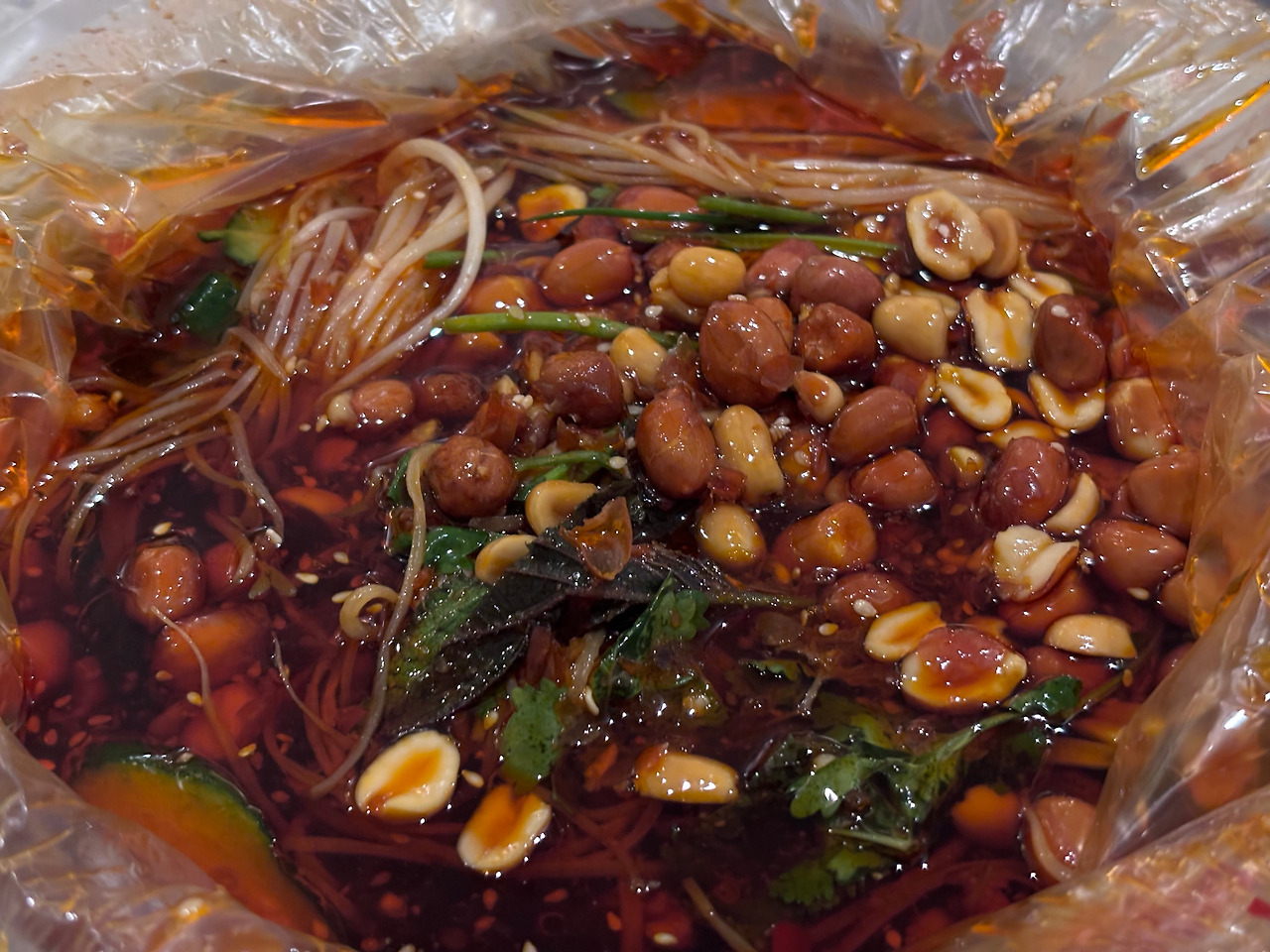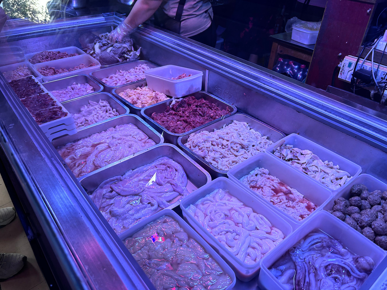 안으로 들어가니 도합 10종이 훌쩍 넘는 온갖 내장들이 아우라를 뿜고 있었습니다. 내장 종류라야 고작해야 서너 가지밖에 모르던 저로서는 그 상당한 그로테스크함에 잠시 흠칫했으나, 왠지 그것들의 정체를 일일이 확인했다가는 발길을 돌리게 될 것만 같아 당당하게 착석했습니다. 가장 보편적으로 팔리는 것 같아 보이는 메뉴로 주문했습니다. 비닐을 씌운 큰 그릇(옛날 분식집 떡볶이 접시에 쓰던 방식을 떠올리면 되겠습니다)에 각종 내장과 채소와 면이 들어가고 견과류들이 흩뿌려져서 나옵니다. 국물은 매운맛과 신맛이 강렬한데, 이럴 수가..무려 차갑습니다.