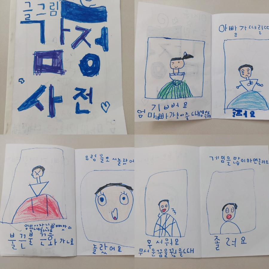 아이가 많이도 성장했다. 사람의 마음을 잘 읽고 눈치가 생긴 듯해서 가끔은 마음이 찡할 때도 있다. 최근에 감정사전이라는 걸 어린이집에서 만들어왔는데, 자신이 언제 어떤 감정이 드는지 간단한 그림에 설명을 붙인 작은 종이책이었다. "엄마가 장난감을 빼앗아갈 때 화나요.", "아빠가 때릴 때 슬퍼요."라고 적나라하게 적혀 있었다. 나도 뜨끔, 신랑도 뜨끔했을 것이다.