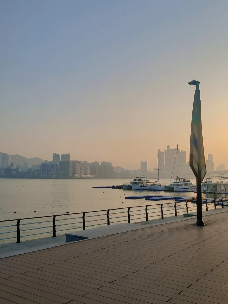 출장을 함께 간 사람들 중 러닝에 참여해보고 싶다는 동료들이 너댓명이 있었는데, 부산 광안리 해변가 앞 호텔 로비에서 만난 사람은 러닝을 처음 추진한 동료 한 명과 나 단둘이었다. 고요한 새벽, 아무도 지나 다니지 않는 호텔 로비에서 차분히 준비운동을 하는 시간이 설레기 그지없었다. 호텔방을 나설 때만 해도 어둑어둑했는데 준비운동을 하는 사이, 어스름한 빛이 조금 더 밝아져 있었다. 고맙게도 어떻게 준비운동을 하면 되는지 알려주는 친절한 시범동작을 따라해가며 몸의 준비도, 마음의 준비도 할 수 있었다. 진짜 해보는구나, 하는 벅찬 마음과 실실 새어나오는 웃음에 입술이 달싹거렸던 것도 같다.