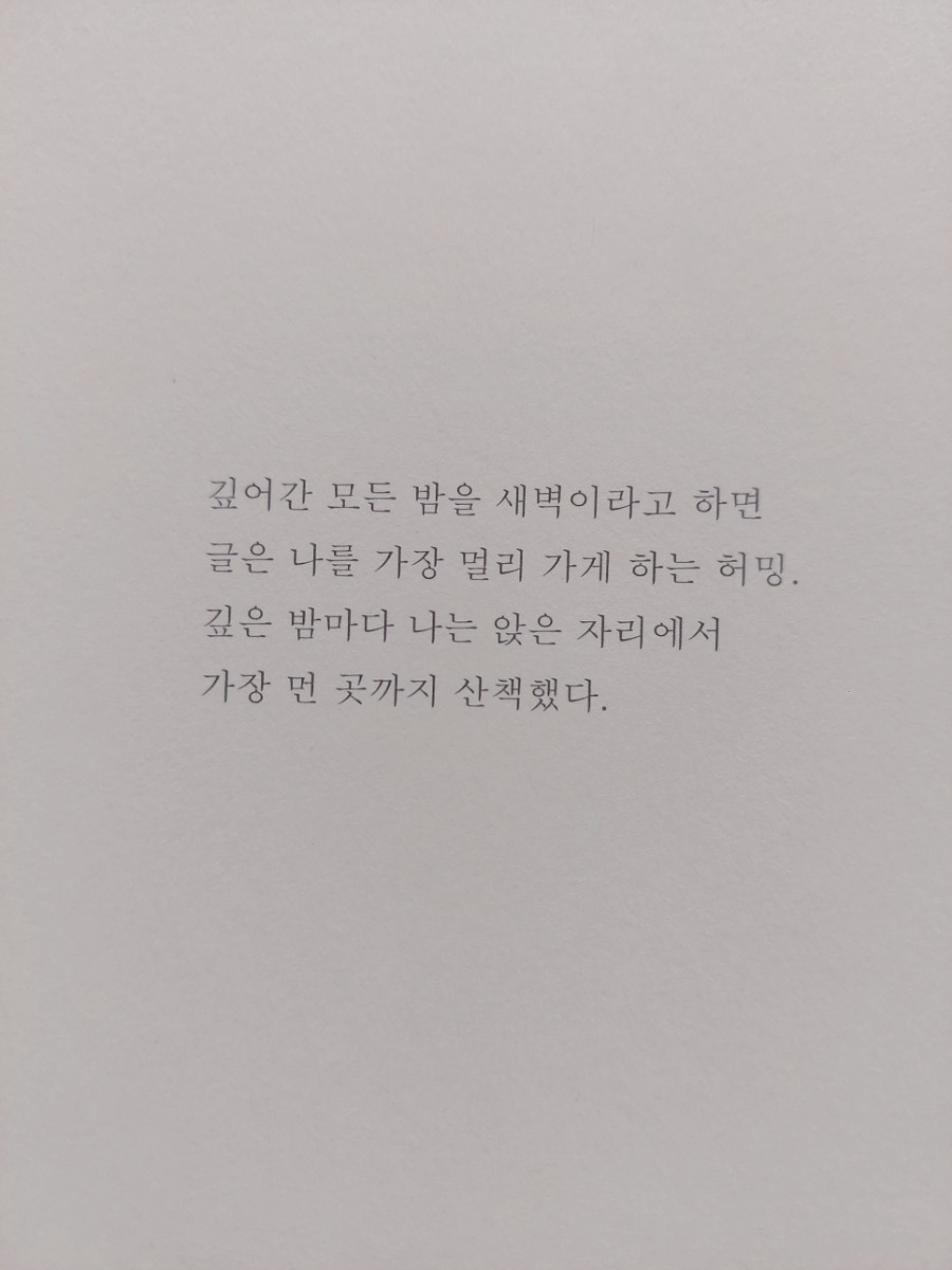 좋아하는 단어들이 다 들어있는 책제목, '새벽 산책 허밍'(Dawn Stroll Humming). 작가가 의미하는 새벽산책허밍은 책 바로 앞에 적혀 있었다. '깊어간 모든 밤을 새벽이라 하면 글은 나를 가장 멀리 가게 하는 허밍. 깊은 밤마다 나는 앉은 자리에서 가장 먼 곳까지 산책했다.'