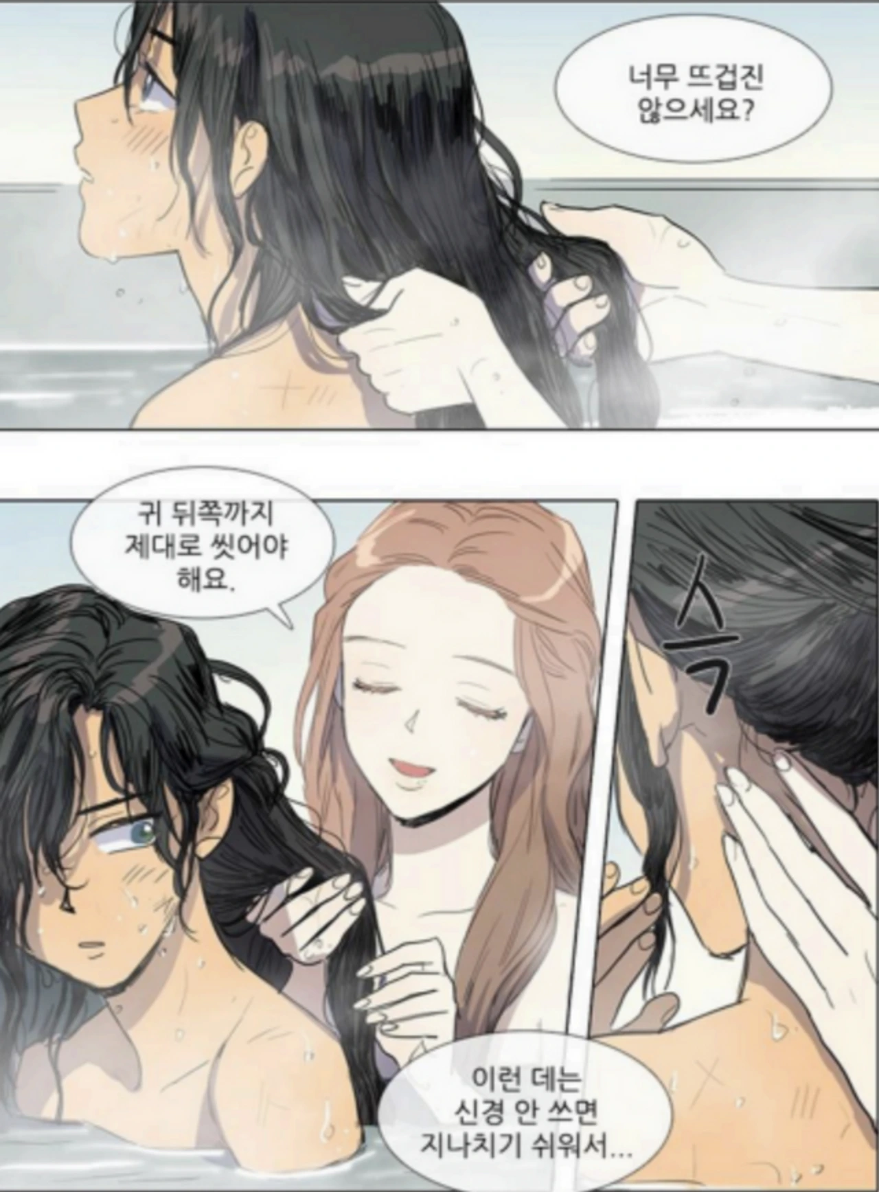 원전 『심청전』에서도 본래 인당수, 수중 용궁, 연꽃 등 물과 관련된 모티프가 나타나는 것처럼, 본작에서도 물의 미장센이 다용된다. 주연 둘은 제1화에서 부인이 배에서 떨어진 연못에서 만나고[4], 욕탕에서 관계가 진전되며(제6화), 절정부에서 생존을 위해 함께 싸우며 갈등이 봉합될 때 비바람은 반동 요소에서 그녀들이 리퀴드하게 섞여드는 매개가 된다(제80화[5]).
