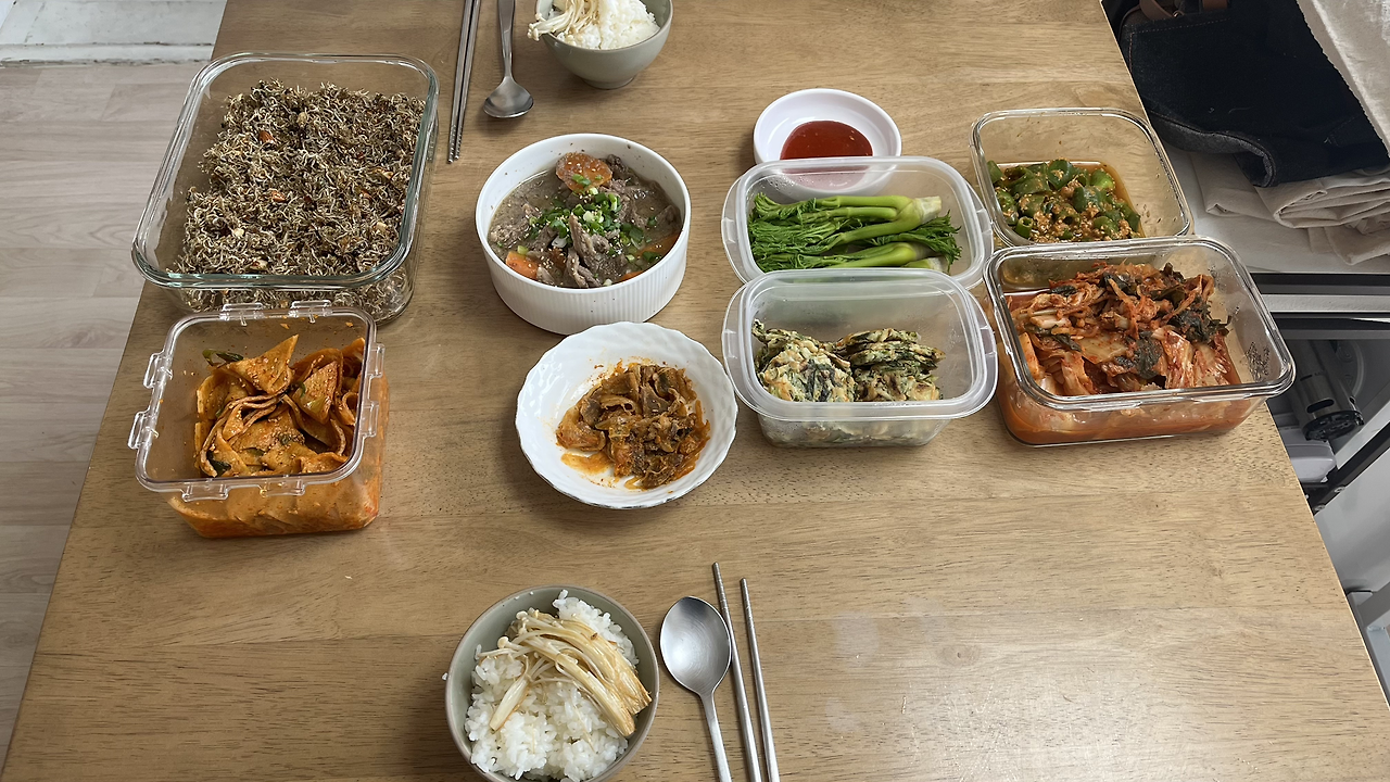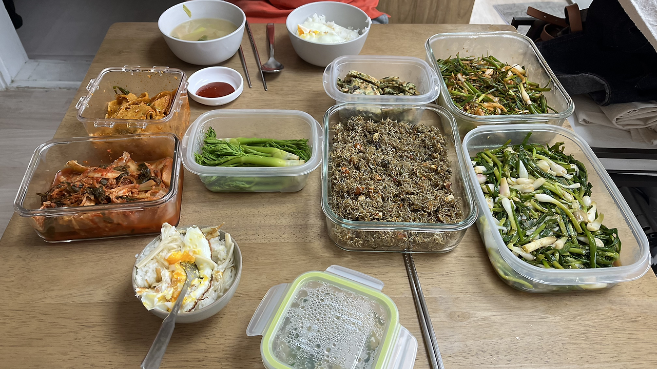 108배를 하고, 부모님, 지인에게 받은 나물들로 푸짐한 아침 식사를 했다. 그 후 스트레칭을 하고, 설거지도 하고, 씻었다. 그리고 책상에 앉아 일을 했다. 그리고 또 점심 먹을 시간이 돼서 점심 식사를 했다.