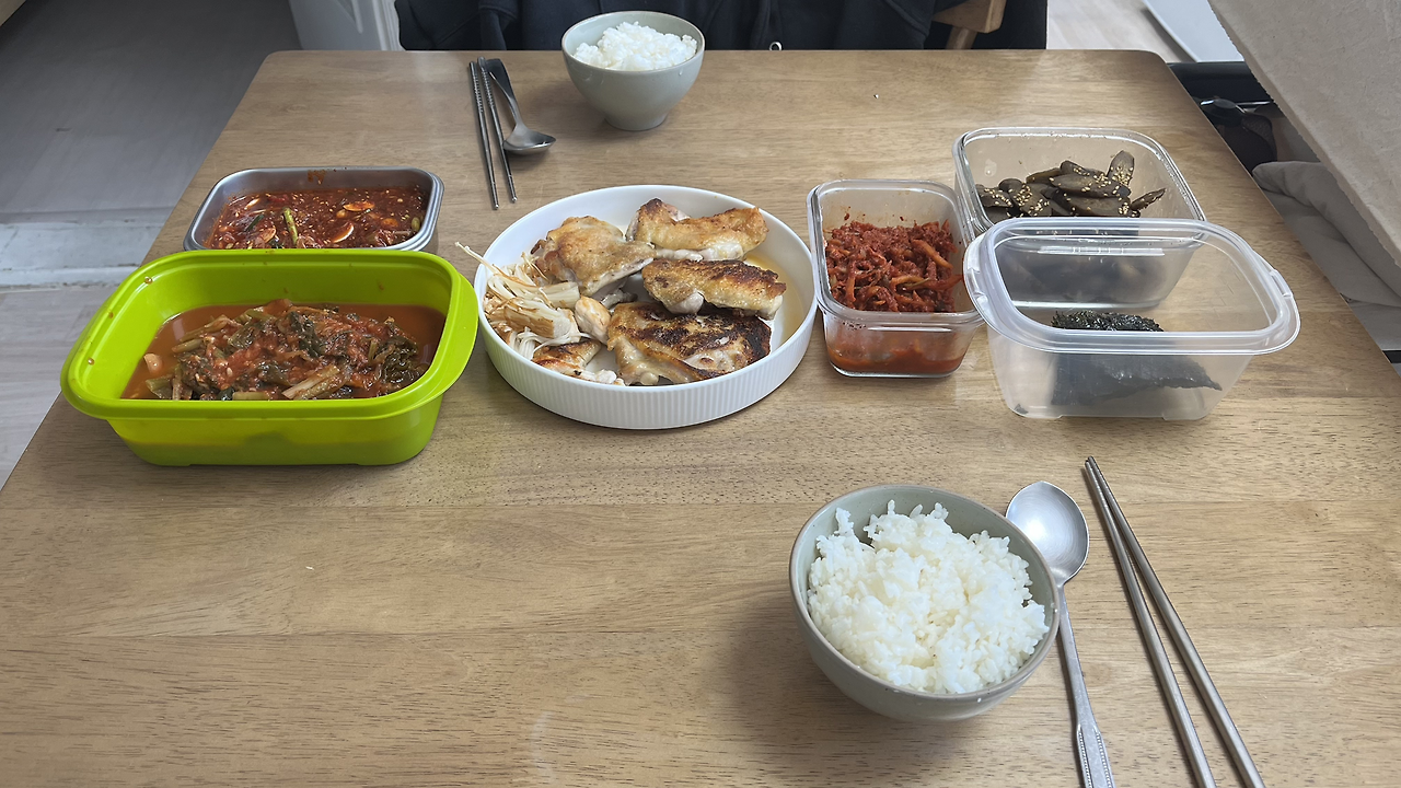 친구 중 한 명은 가구점에서 일하고 있는데 잠시 나와 꼬막무침을 받아 갔고, 다른 한 명은 카페에서 일해서 그 카페에 가서 커피도 얻어 마시고, 이야기도 나누다가 도시락을 챙겨 아르바이트에 가야 해서 집에 돌아왔다.