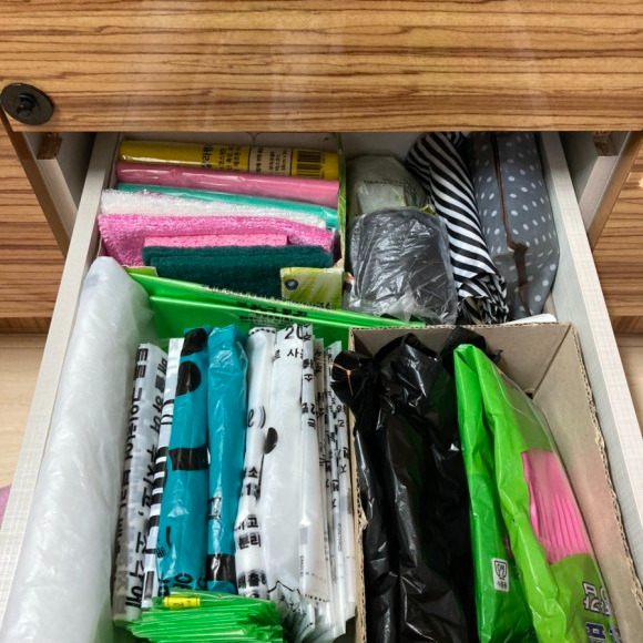 잡동사니 가득한 서랍은 이렇게 재활용 박스를 이용해 공간을 구획한 후 정리해주셨는데, 10봉지씩 묶여있는 쓰레기봉지를 한 장씩 분리해 이쁘게 접어놓으신 것을 보고는 그저 경악할 뿐이었다.
