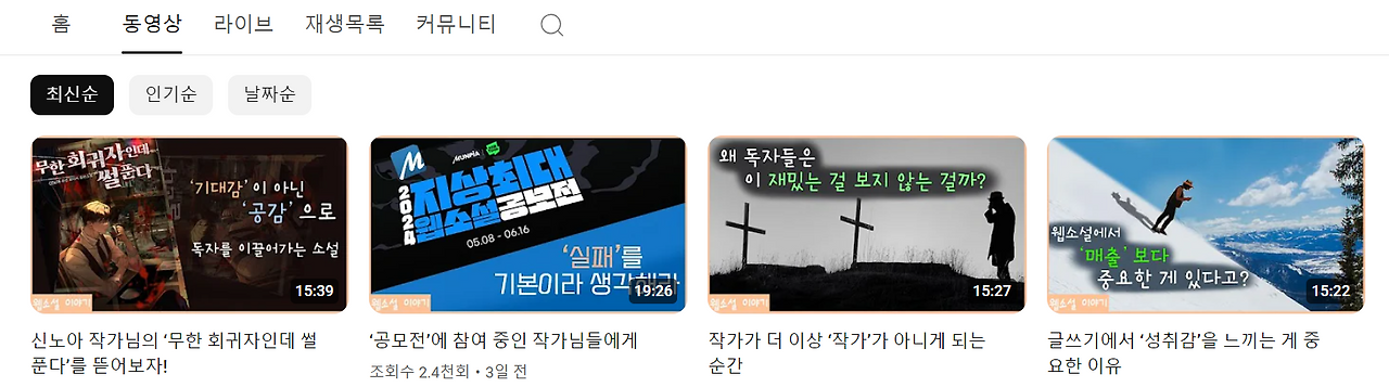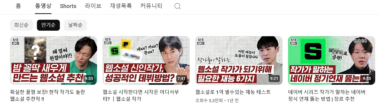 유튜브에서도 도움이 되는 정보를 꽤 많이 얻었다. 소설 집필에도 도움이 컸고. 유튜브에는 웹소설 관련 영상이 굉장히 많기 때문에 어떤 채널이 좋은지 옥석을 가리기가 힘들 것이다. 여기에서는 내가 특히 도움을 많이 받았던 채널 두 개를 소개하고자 한다.