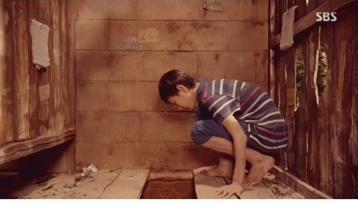 위 사진에서는 변소 안 구멍을 들여다보고만 있는데, 드라마에서는 결국 저 구멍 안으로 들어가서 숨는다. 그래서 극 중 조인성에게 트라우마가 생기게 된다. 아빠를 피해 도망쳤던 화장실(변소)에서 편안함을 느껴서, 화장실에서만 잠을 잘 수 있게 된 것이다.
