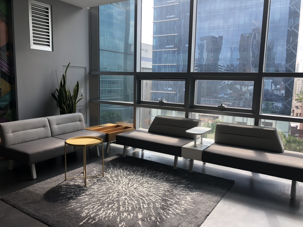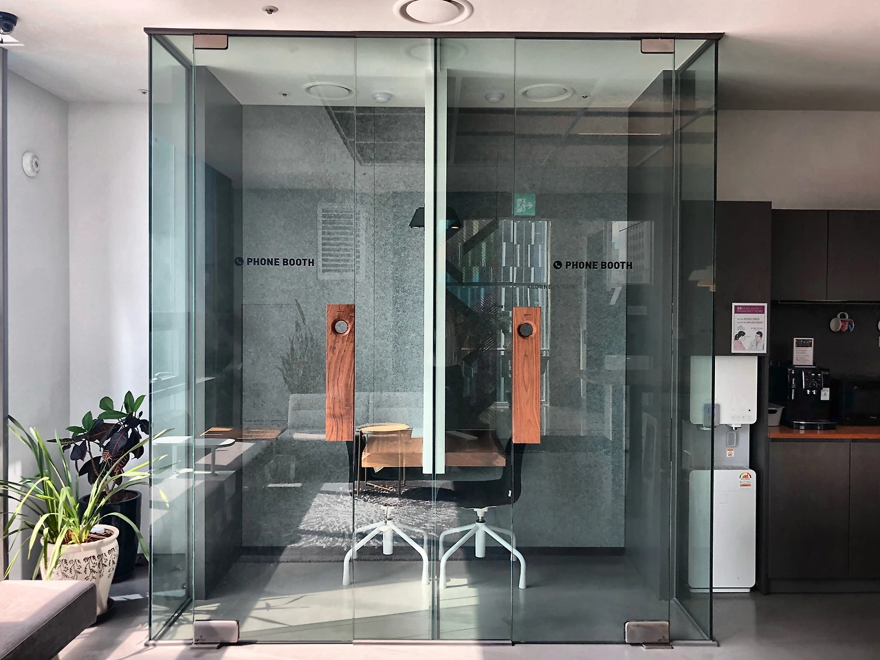 이 외에도, 사무실이 있는 5,7,8층에는 층별로 스낵바와 콘센트가 완비된 넓은 테이블이 마련되어 있다. 그래서 사무실을 나와 테이블에서 작업하는 입주자분들도 있다고 한다. 그 옆에는 사적인 전화통화가 가능한 폰부스와 휴식 소파가 있다. 소파 뒤쪽으로는 창문이 언제나 함께 한다.