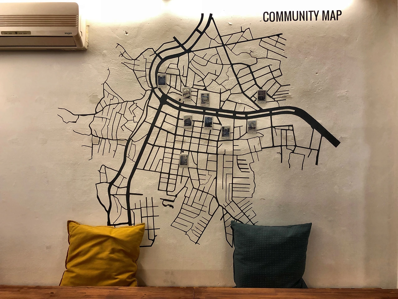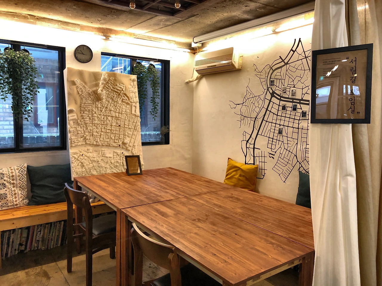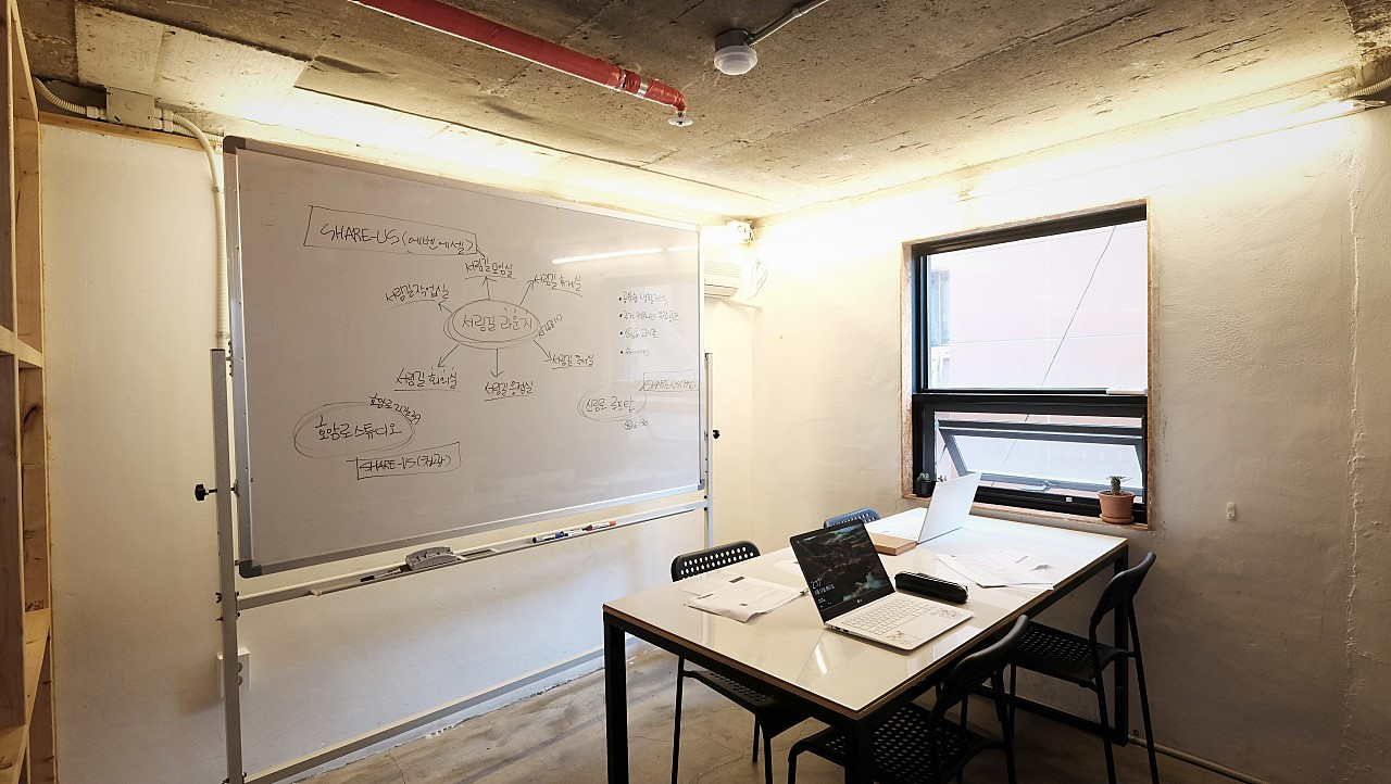 '서림길 모임실'은 3곳 중 가장 큰 공간이다. 다닥다닥 붙어 앉으면 7명까지도 수용 가능하지 않을까 싶다. 모임실의 매력 포인트는 신림동의 지도와 쉐어어스의 지점별 위치를 확일할 수 있다는 거다. 벽면에는 신림동 지도가, 창문 쪽에는 신림동 모형이 제작되어 있어서 3D로도 신림동과 쉐어어스의 위치를 볼 수 있다.