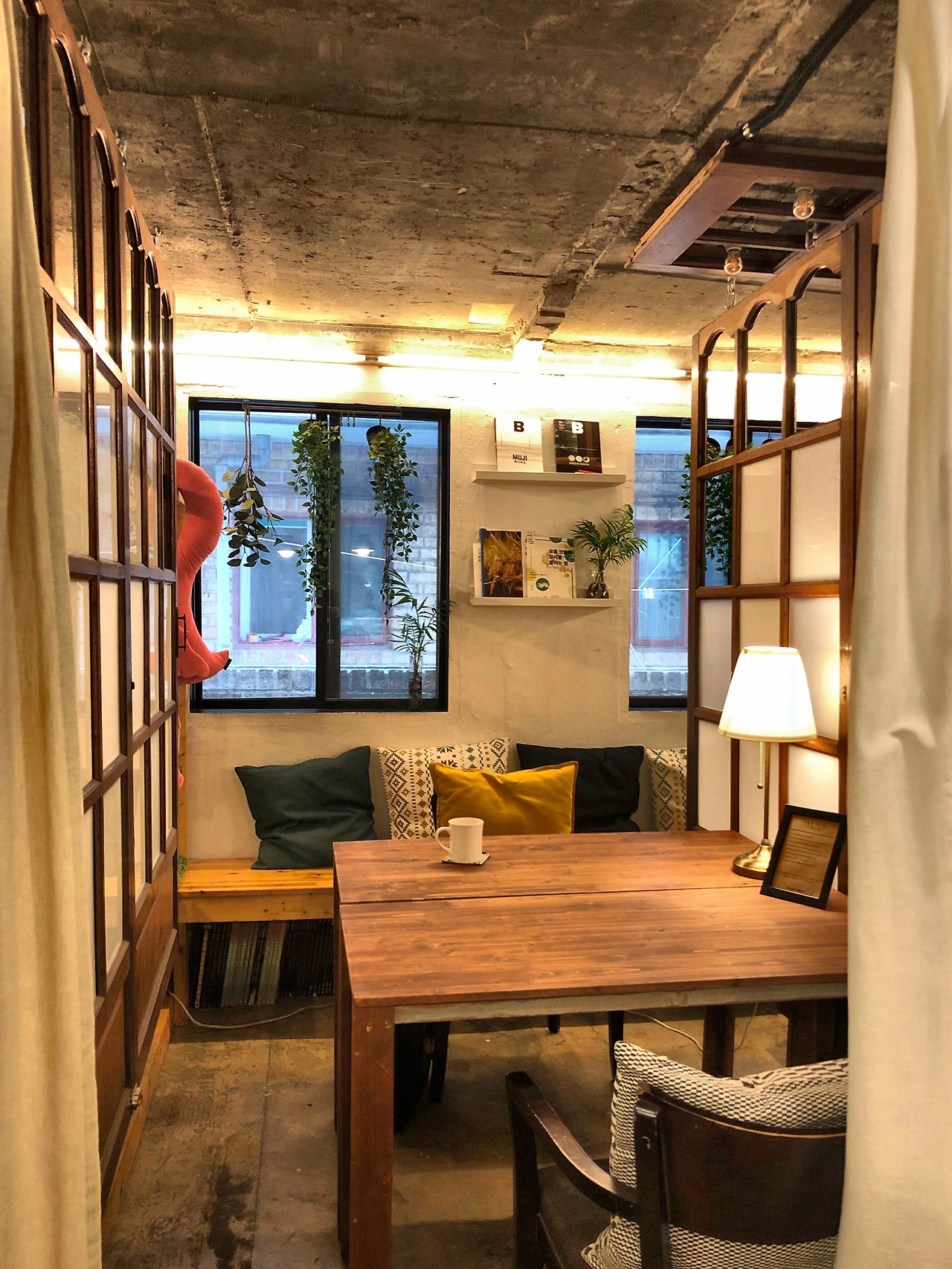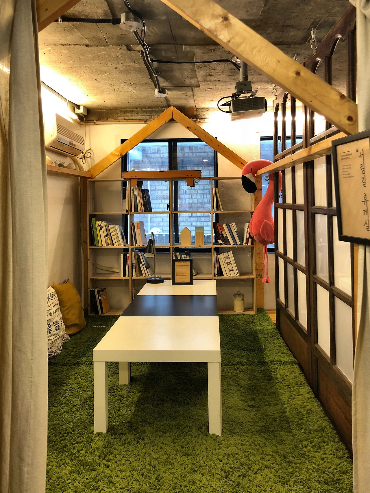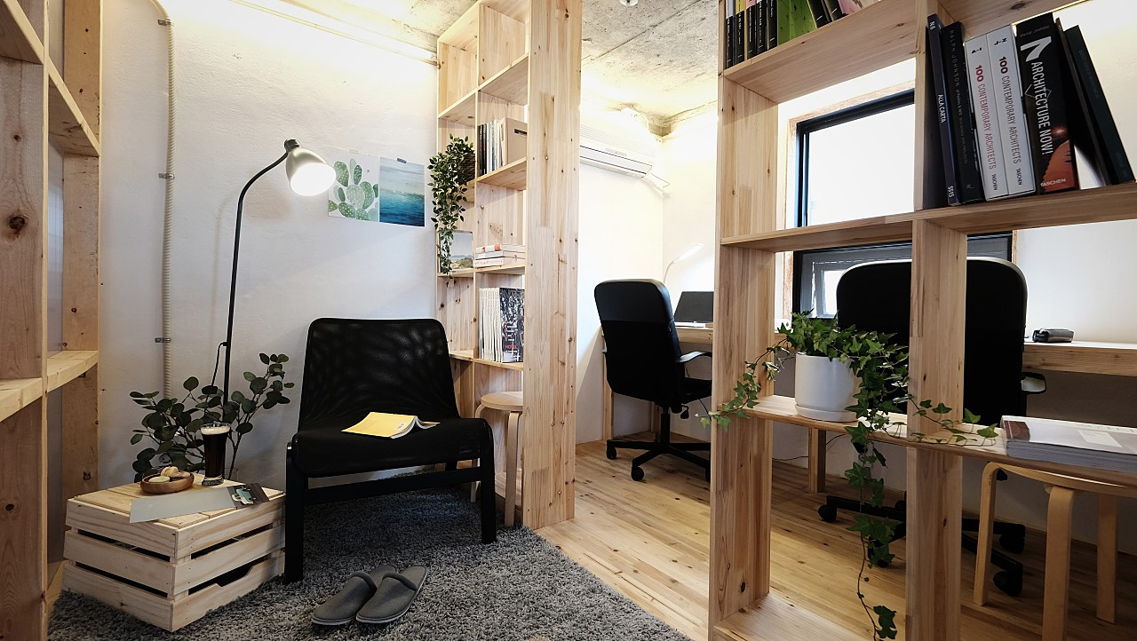 그리고 각 공간 사이의 구획은 '문짝'이 담당한다. 마치 옛날 할머니 집에서 볼 수 있을 법한 나무로 된 미닫이 문짝이 천장에 매달려 있어, 파티션 역할을 하고 있다. 양 옆에는 나무 문짝이, 뒤에는 벽이, 앞에는 하얀 커튼이 있어 4개의 면을 모두 막고 있지만, 전혀 답답하지 않다. 오히려 아늑하다. 바닥과 천장 쪽으로는 모두 뚫려 있고, 파티션과 커튼이 시선만 가리는 역할을 하기 때문이다. 사람들의 소리도 들리고, 앞쪽 키친에서 요리하는 소리도 들린다. 또한 파티션 역할을 하는 문짝은 이동이 가능하다. 모임과 클래스가 있으면, 문짝을 천장에서 떼어내 하나의 큰 공간으로 변형할 수 있다.