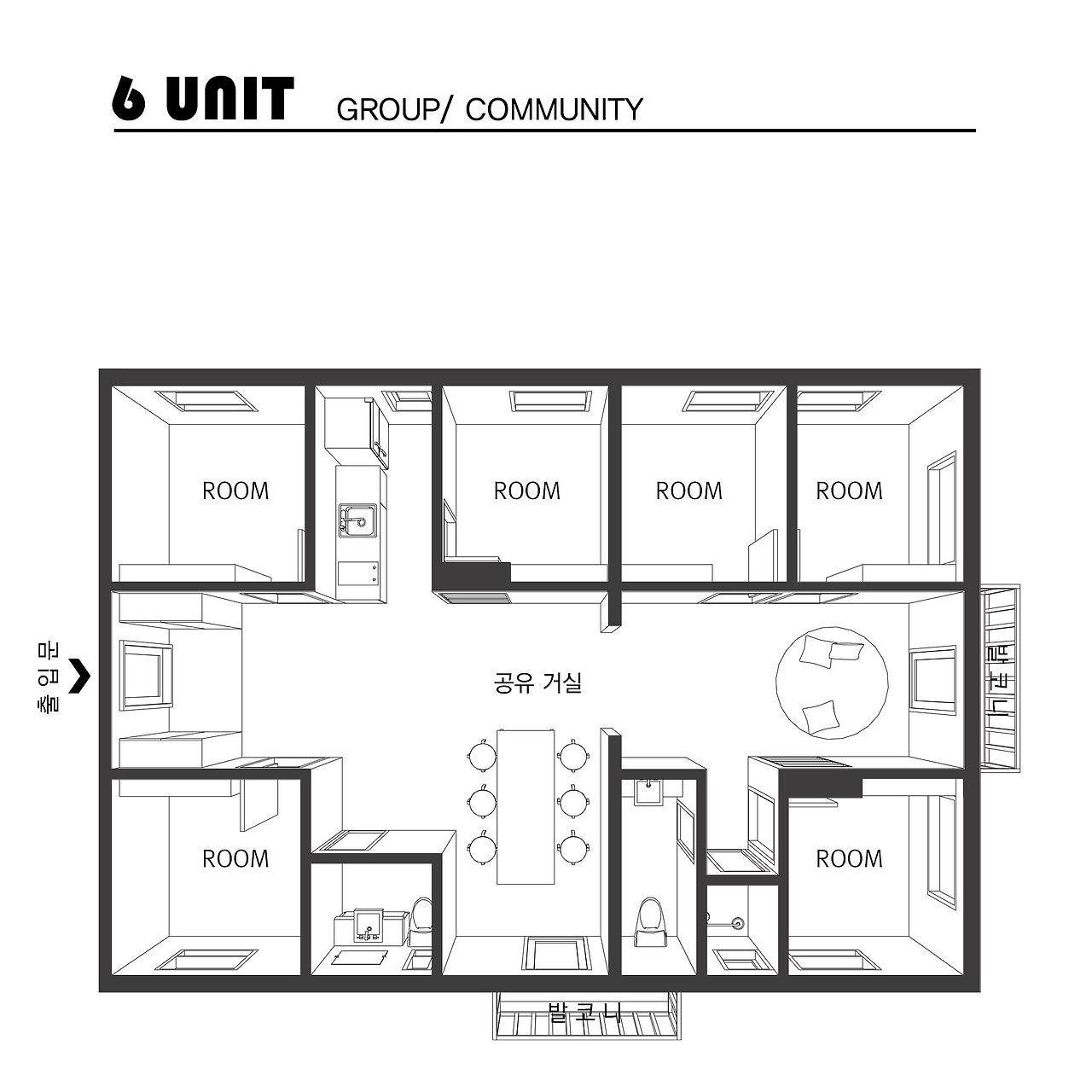'3 유닛'은 세 명이 교류하며 사용할 수 있는 공간으로, 개인실 3개와 거실형 공유공간으로 구성되어 있다. 핵가족이 거주하는 아파트의 형태를 생각하면 된다. 6유닛은 3유닛의 확장이다. 6개의 개인실과 거실, 부엌, 발코니, 화장실 2개로 구성되어있다. 더 많은 사람과 일상을 공유할 수 있다. 6유닛에는 별도의 부엌이 있어서 다른 유닛에 비해 커뮤니티가 더 활발하다고 한다.